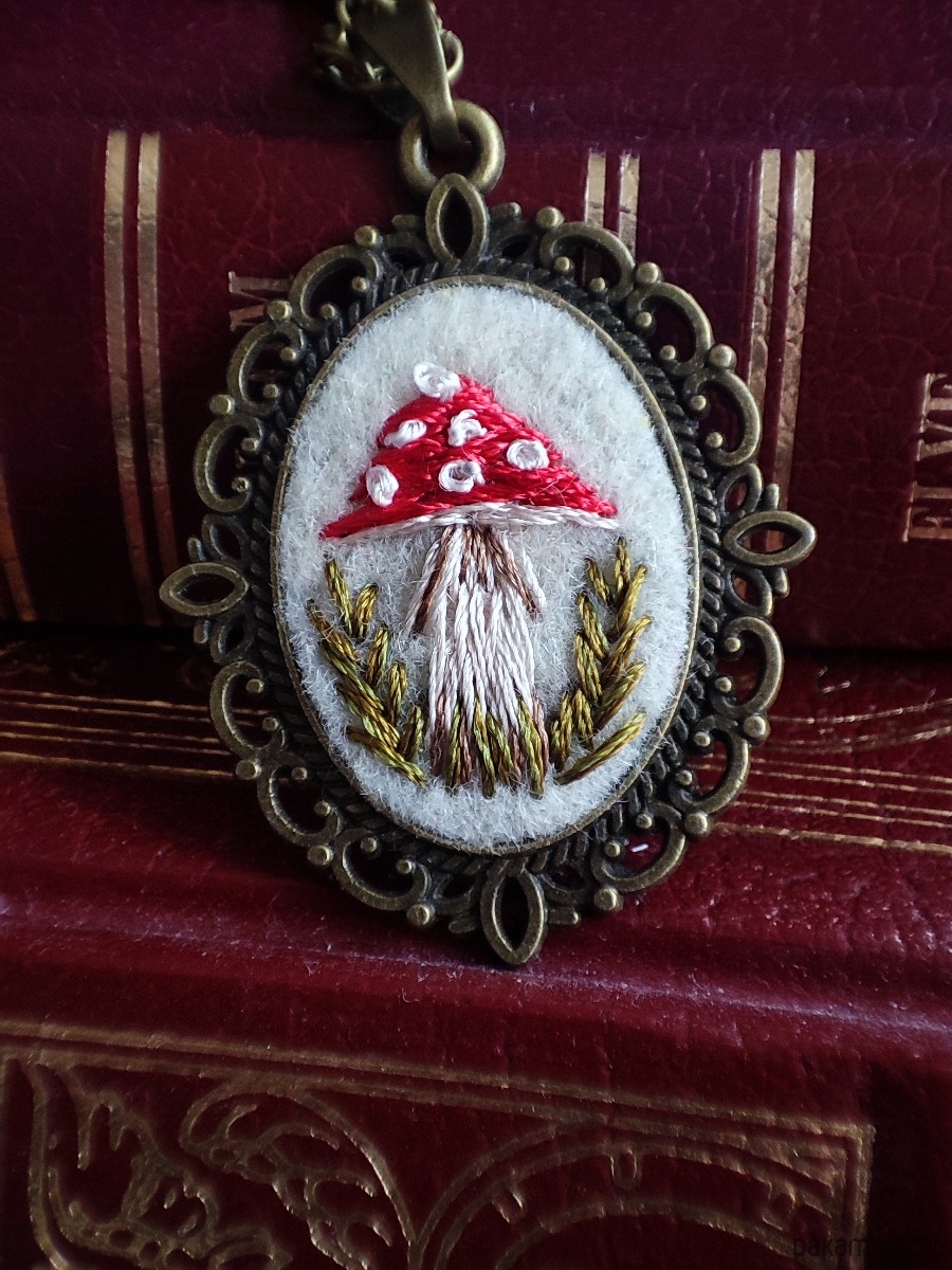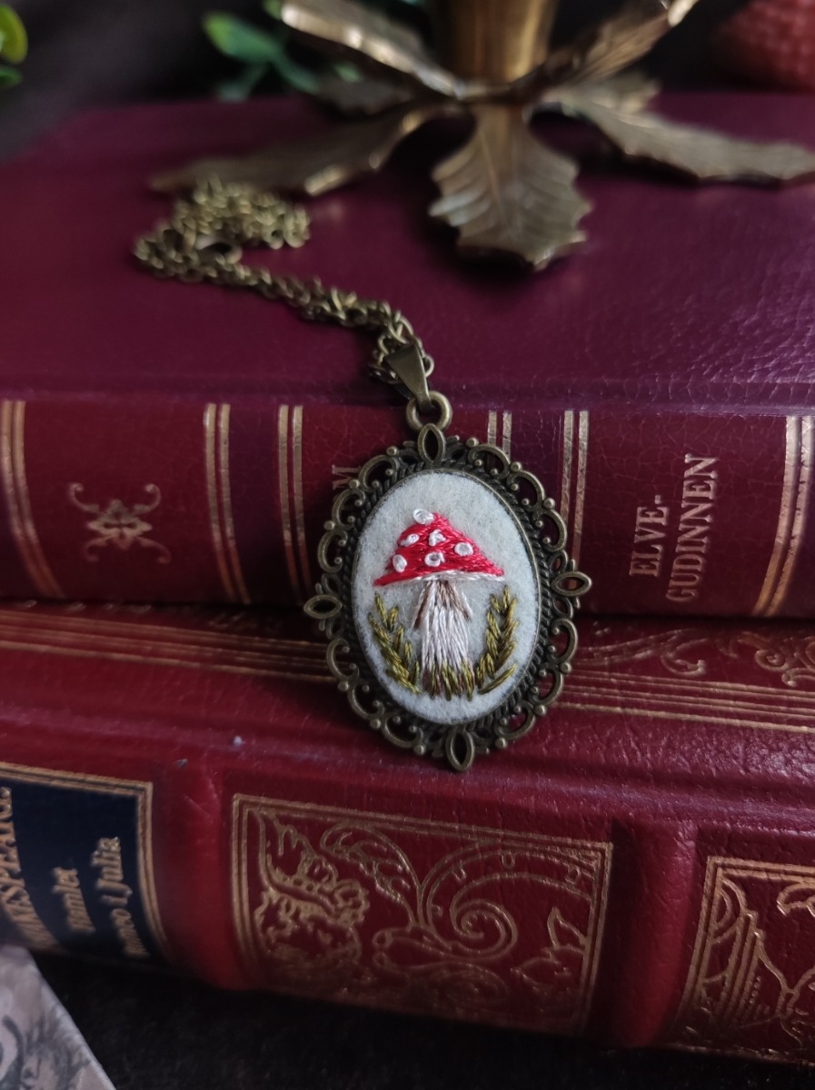 Haftowana biżuteria, vintage handmade jewelry, witchcore fairycore, whimsical, floral embroidered pendant muchomor grzyb grzyby muchomorki