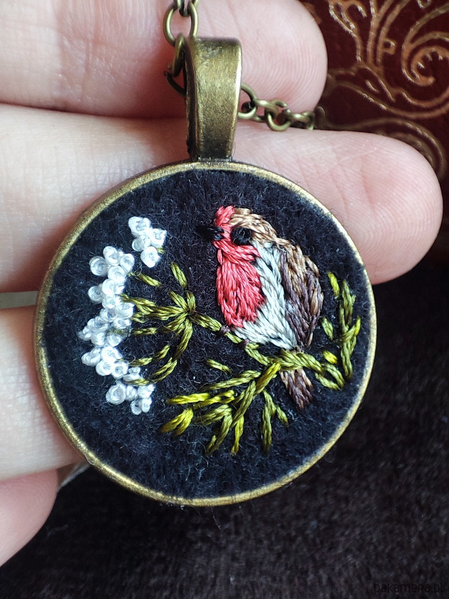 Haftowana biżuteria, vintage handmade jewelry, witchcore fairycore, whimsical, floral embroidered pendant rudzik ptaszek