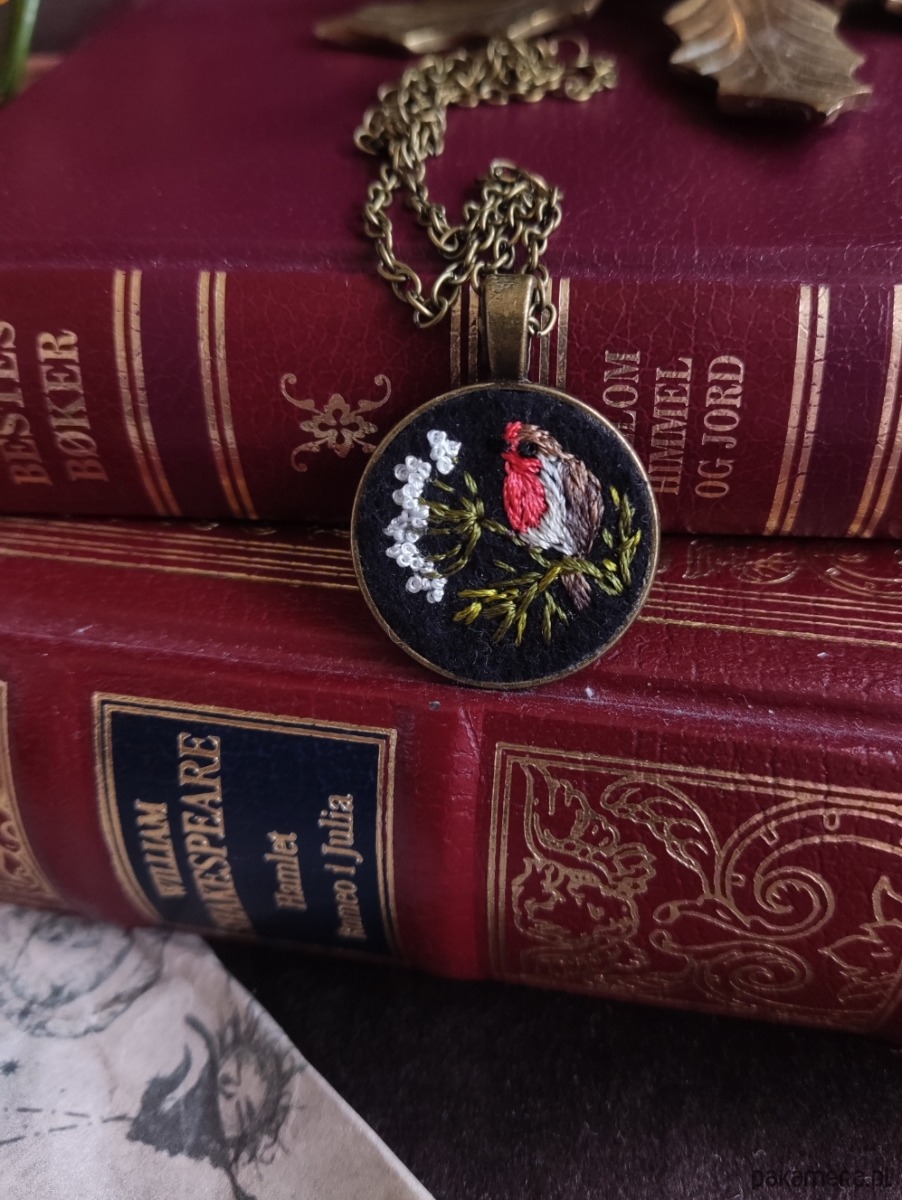 Unikatowa haftowana zawieszka z ptaszkiem rudzikiem
