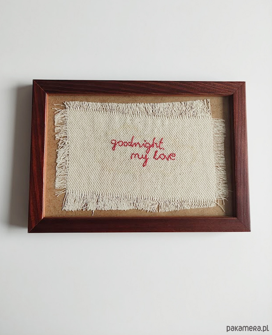 Czuły i uroczy napis został wykonany czerwoną nitką na bawełnianym płótnie.