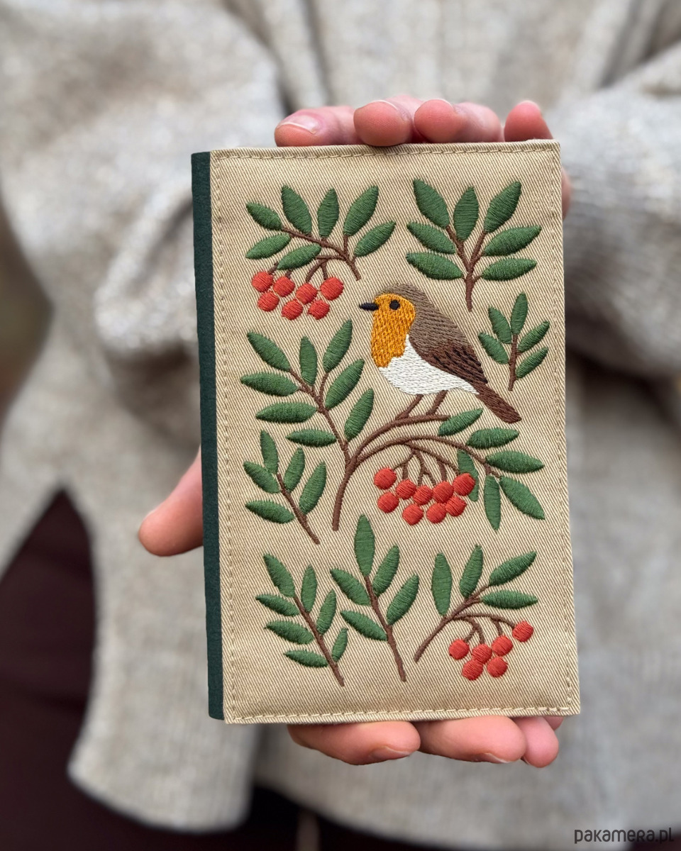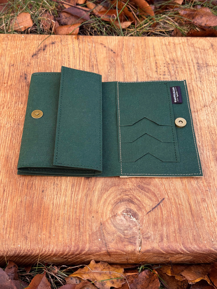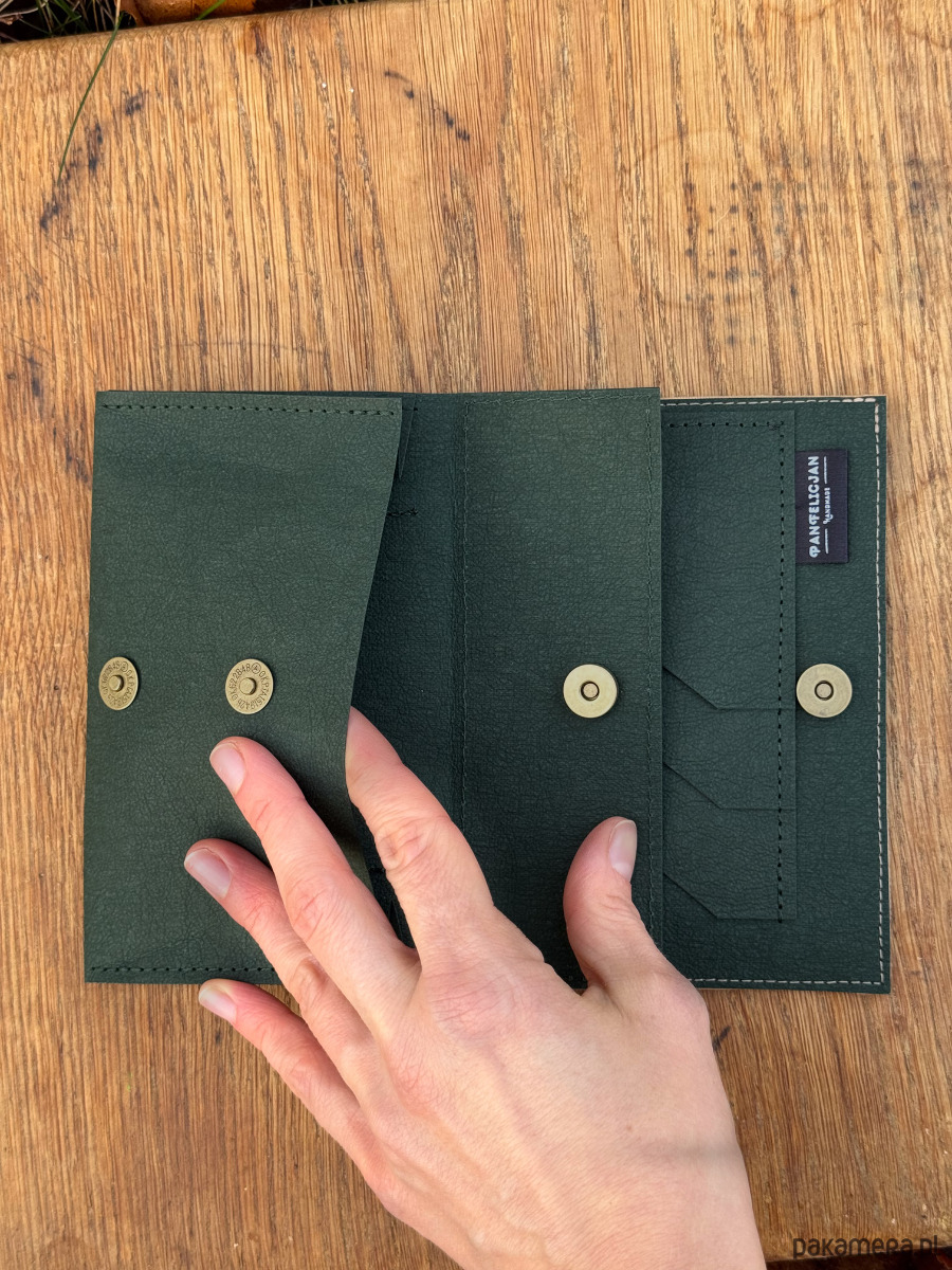 Haftowany portfel wykonany z impregnowanego papieru i bawełny. Jest 100% wegański.
