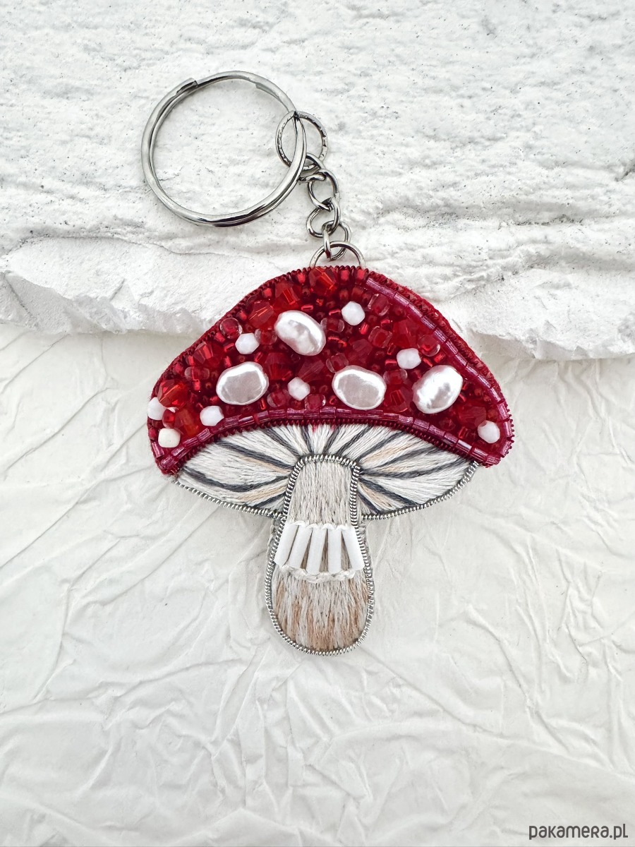 Brelok muchomor haftowany ręcznie muliną, koralikami i perełkami.