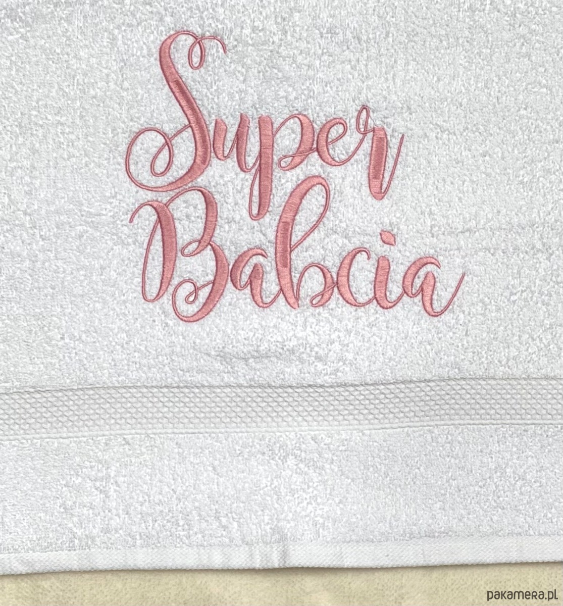 Podaruj swojej babci coś wyjątkowego – biały ręcznik z pięknym haftem "Super Babcia" w delikatnym odcieniu różu.