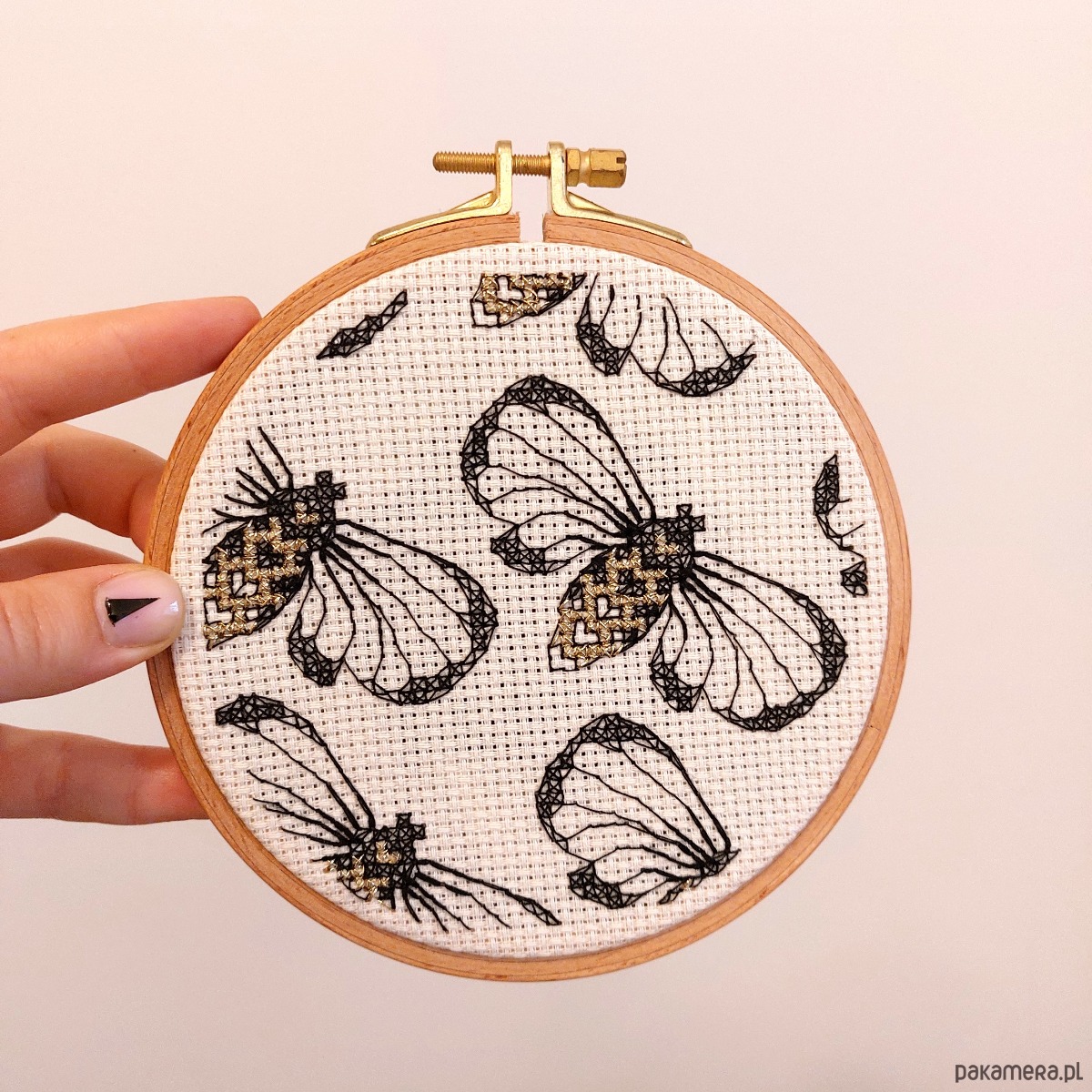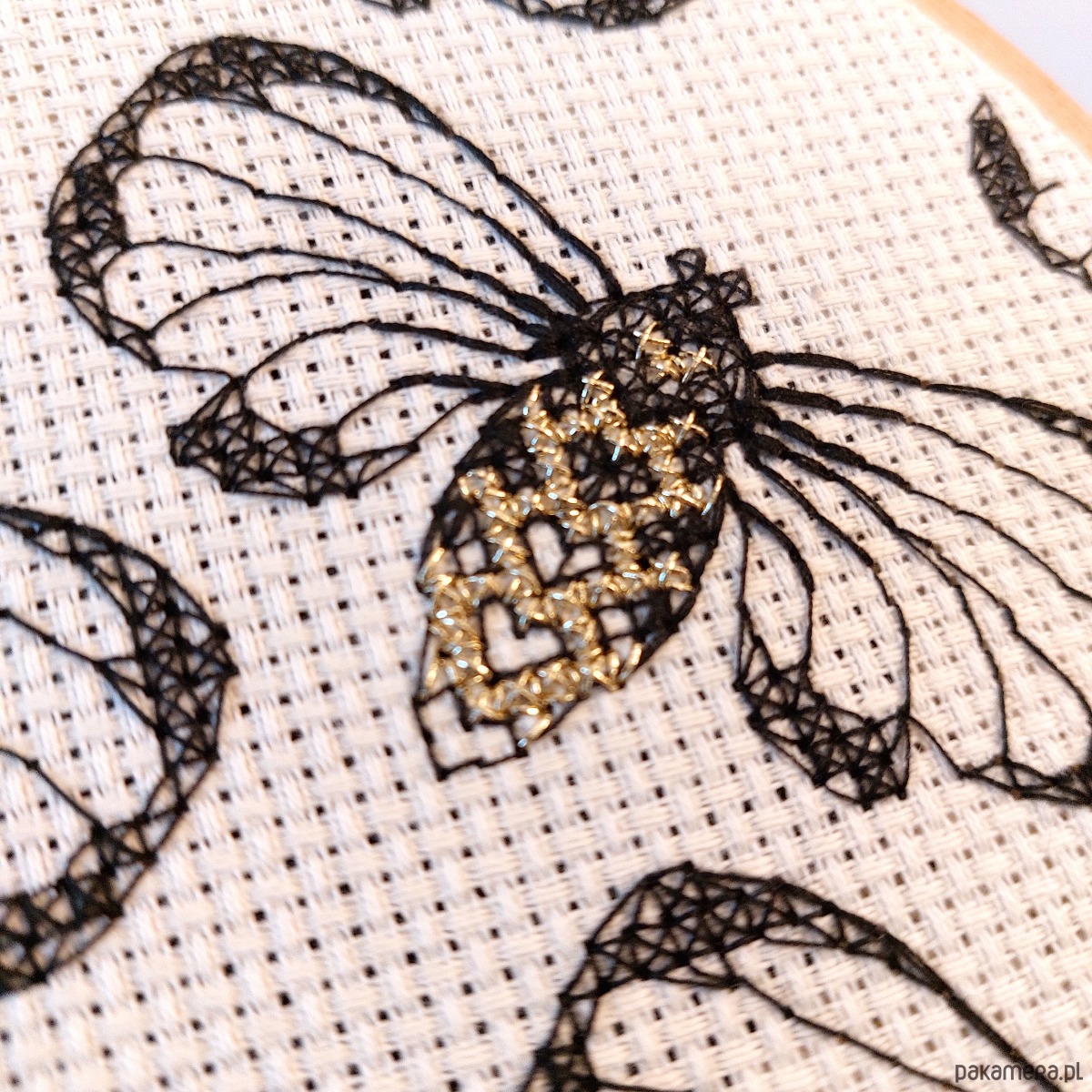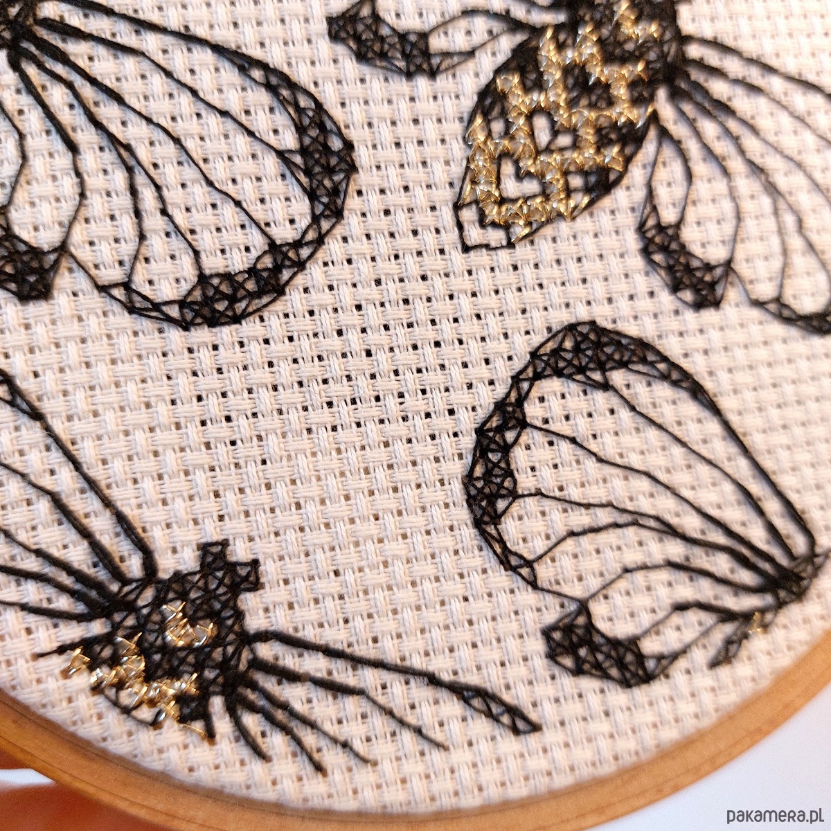 Haft wykonany na beżowej kanwie czarną i złotą nicią.