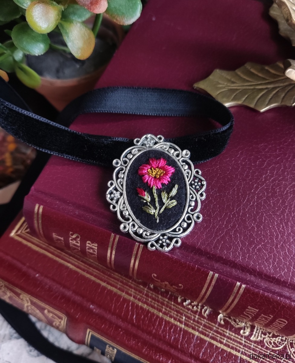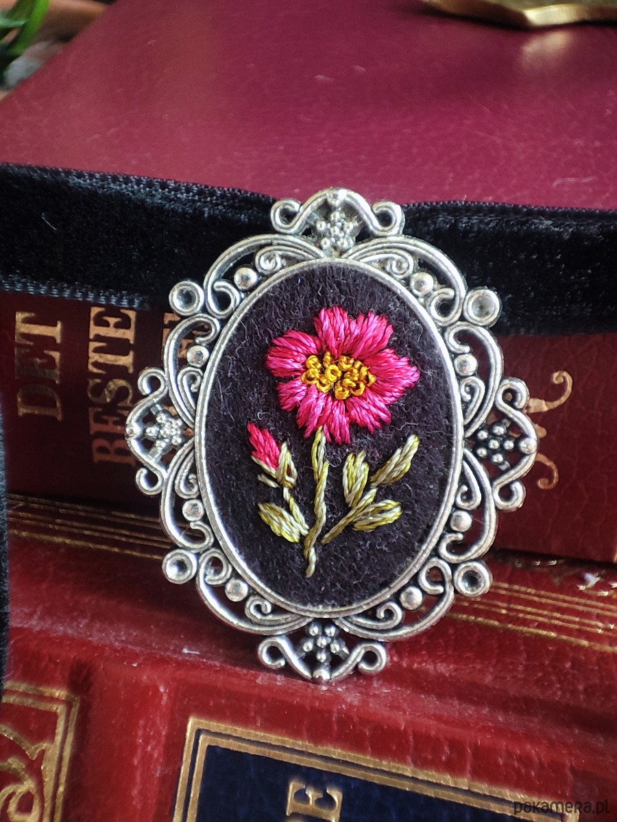 Haftowana biżuteria, vintage handmade jewelry, haft ręczny, embroidered pendant, haftowane kwiaty, dzika róża