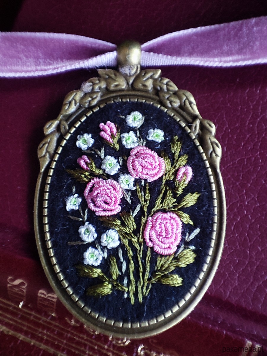 Haftowana biżuteria, vintage handmade jewelry, haft ręczny, embroidered pendant, haftowane kwiaty, roże, biżuteria wiosenna