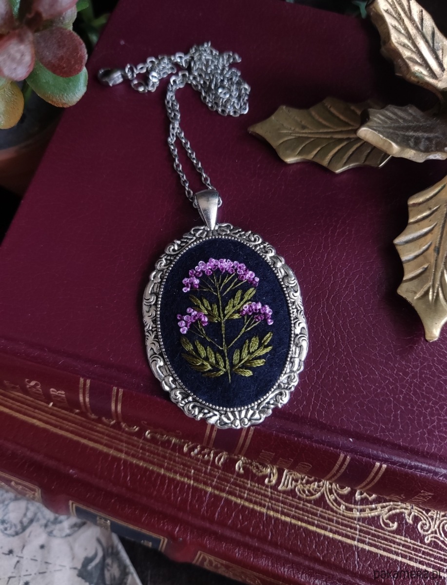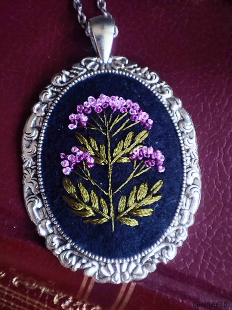 Haftowana biżuteria, vintage handmade jewelry, haft ręczny, embroidered pendant, haftowane kwiaty, waleriana
