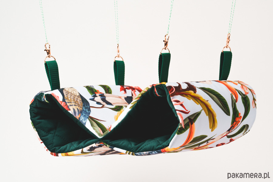 Hamak z tunelami to ideał dla "świnkowej" rodzinki. Zawieszony w klatce zapewni nie tylko atrakcje do skakania, ale i miejsce do wspólnego odpoczynku. Wykonany ze stabilnej owaty, dzięki czemu zachowuje swoją miękkość. Posiada mocne pasy nośne dla lepszego podtrzymania.
