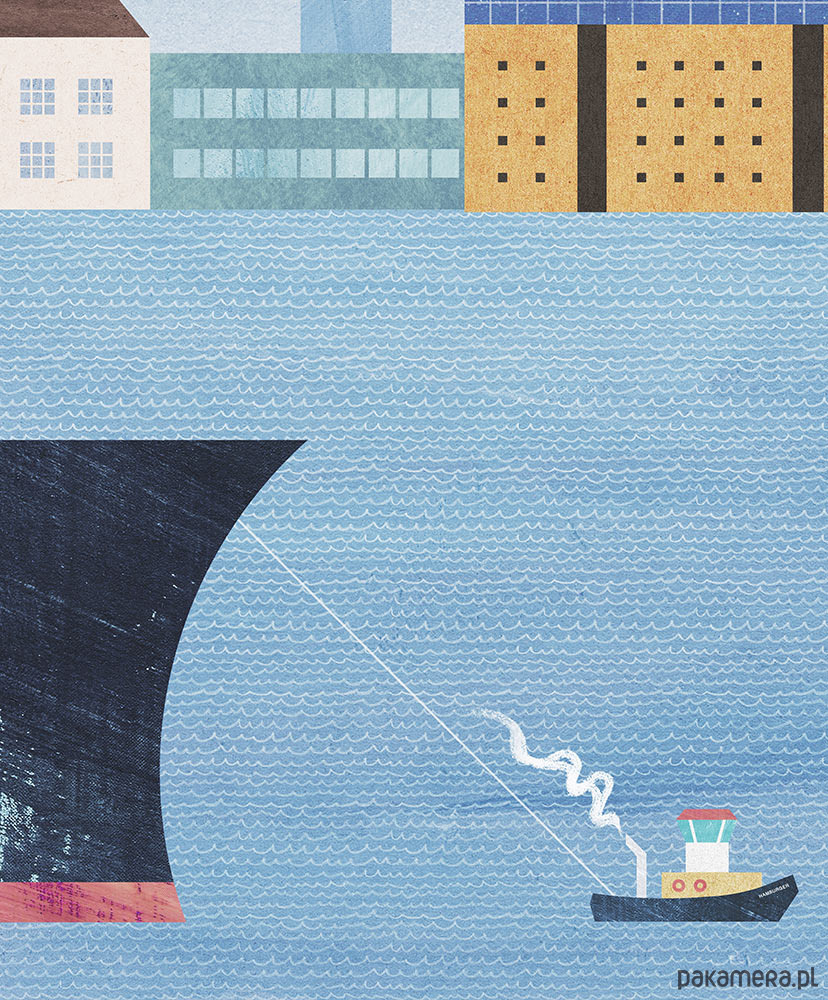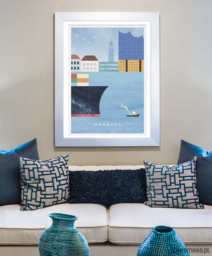 Plakat podróżniczy z Hamburgiem, jednym z bardziej urokliwych miast portowych. Na plakacie widzimy charakterystyczne dla miasta żagiel budynku filharmonii, czy wieżę kościoła Św. Michała. Na pierwszym planie ogromny kontenerowiec holowany jest do portu.
