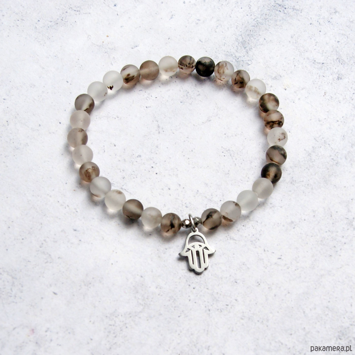 TUTAJ: bransoletka na solidnej lince elastycznej wykonana z kul MATOWEGO KWARCU (6mm); zawieszka ze stali szlachetnej = wszystkie elementy są ANTYALERGICZNE.