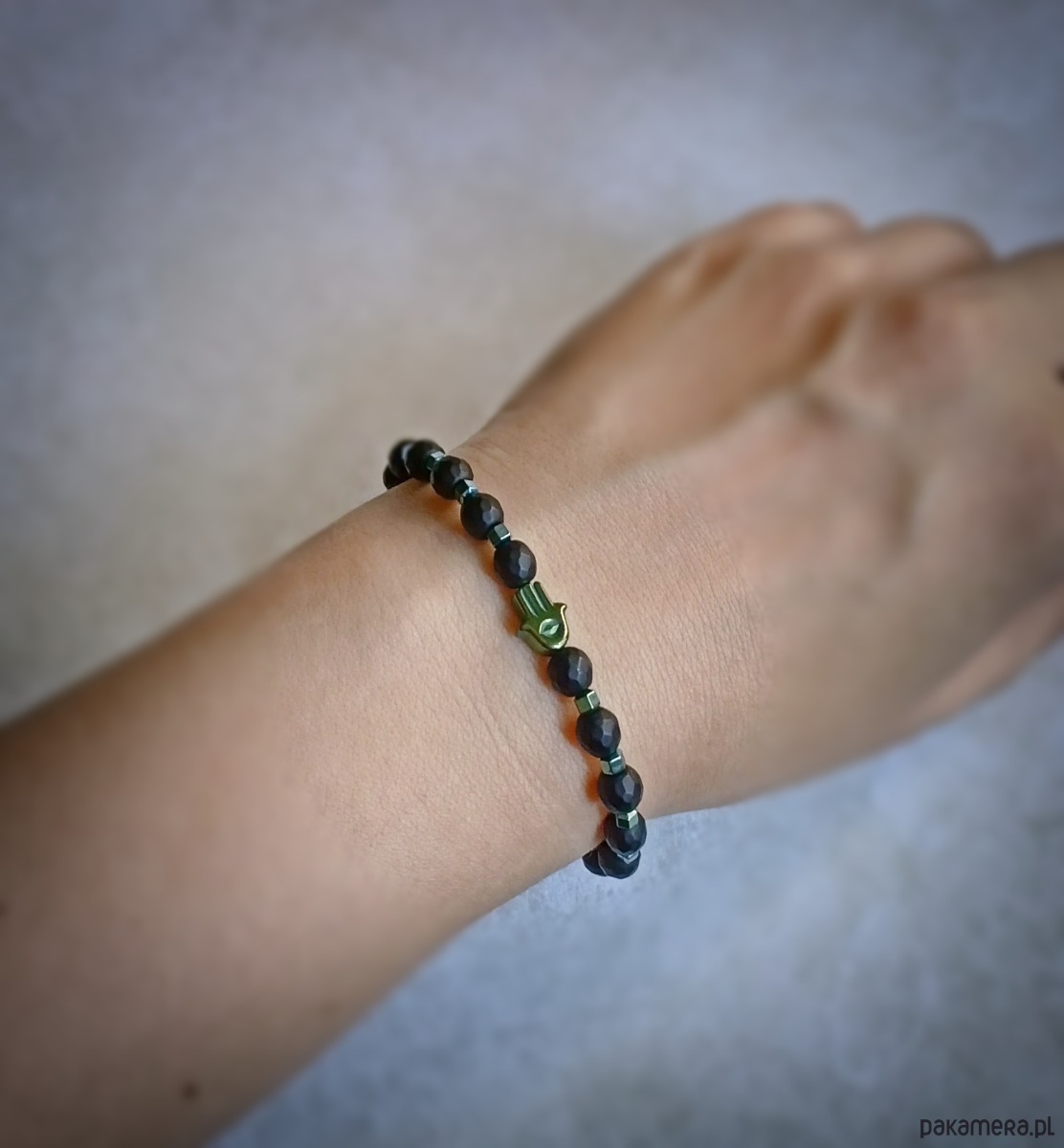 HAMSA - ochrona - fasetowany onyks mat, hematyt emerald