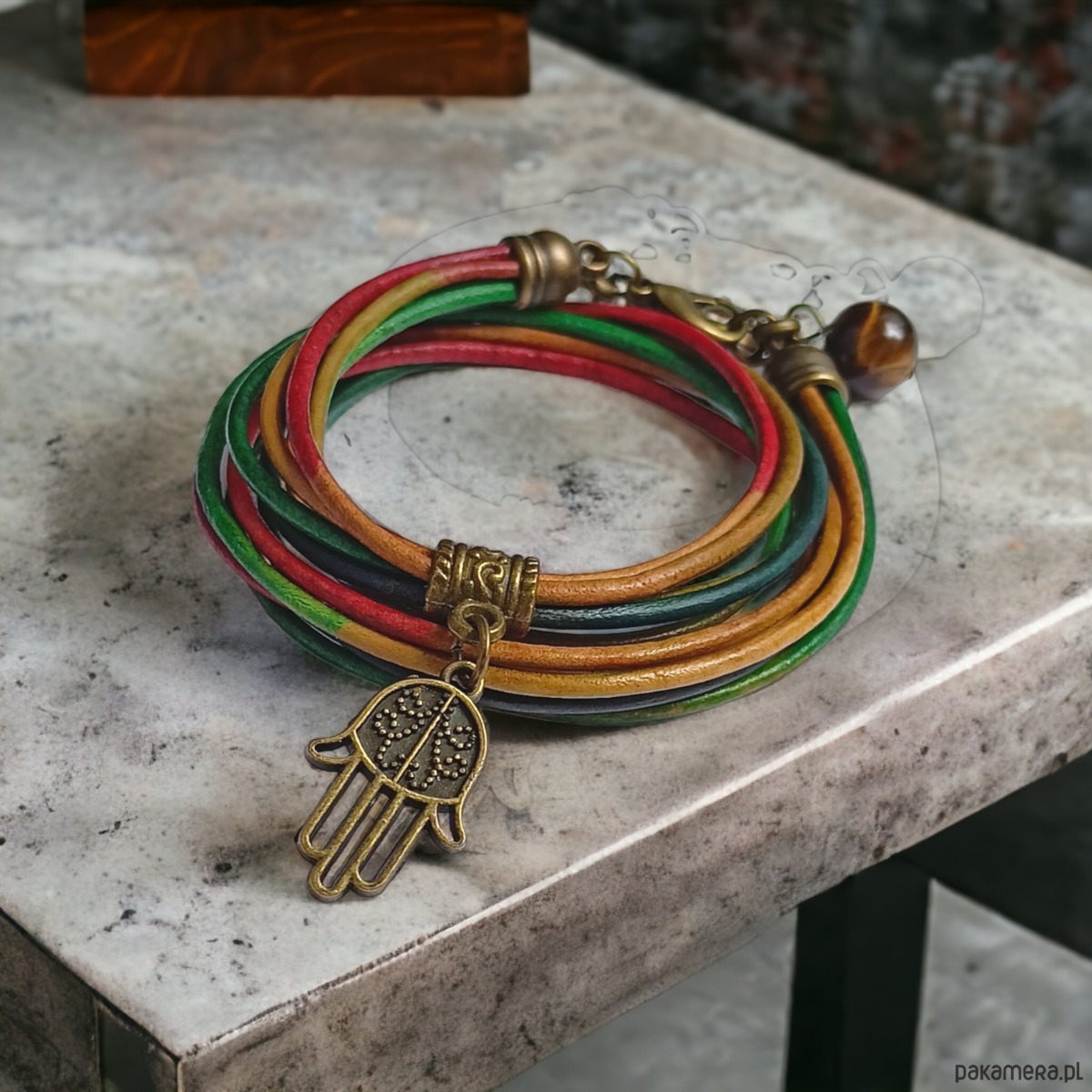 kolorowa bransoletka wykonana z 6 rzemieni ze 100% skórki naturalnej ( 2mm )). zawieszka i wykończenie w kolorze antycznego złota. długość regulowana za pomocą łańcuszka.