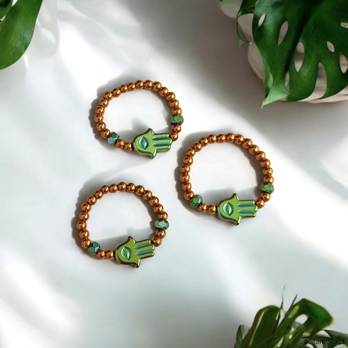 Hamsa - talizman chroniący od zła - pierścionek - hematyt emerald