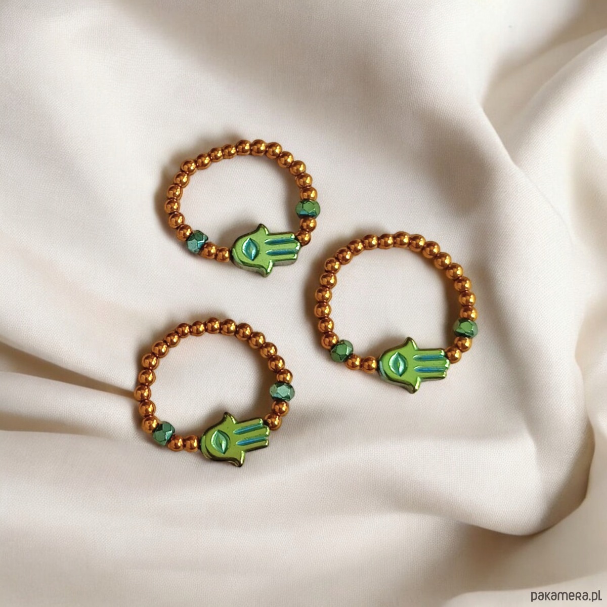 Hamsa - talizman chroniący od zła - pierścionek : hematyt emerald