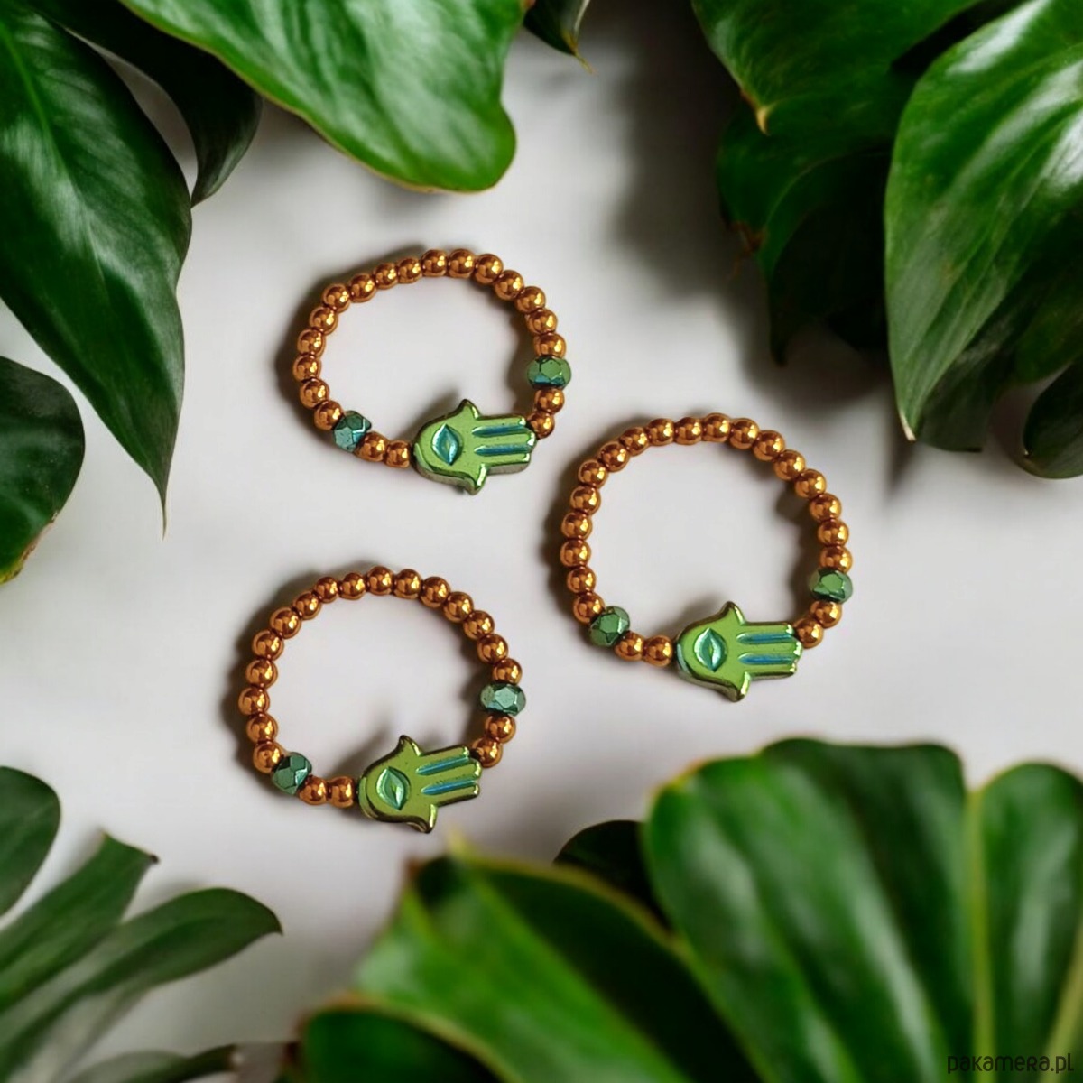 Hamsa : talizman chroniący od zła - pierścionek : hematyt emerald