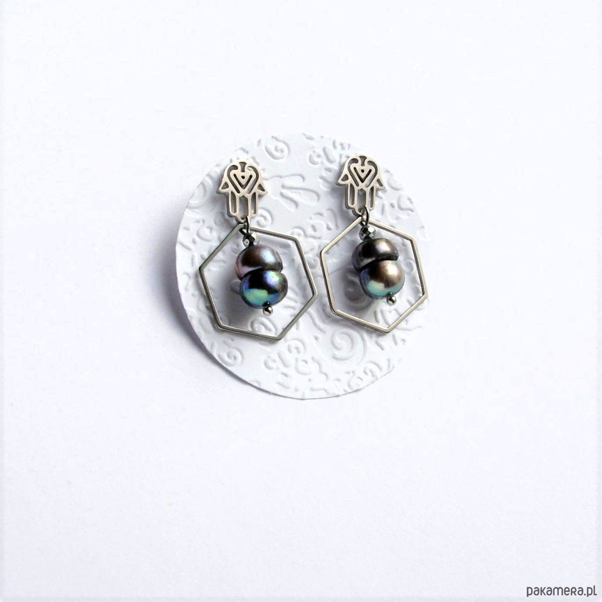 wykonane z perełek słodkowodnych w nietypowym kształcie i odcieniu - ciemne, opalizujące (ok. 10mm), z dodatkiem drobnych kuleczek fasetowanego hematytu.