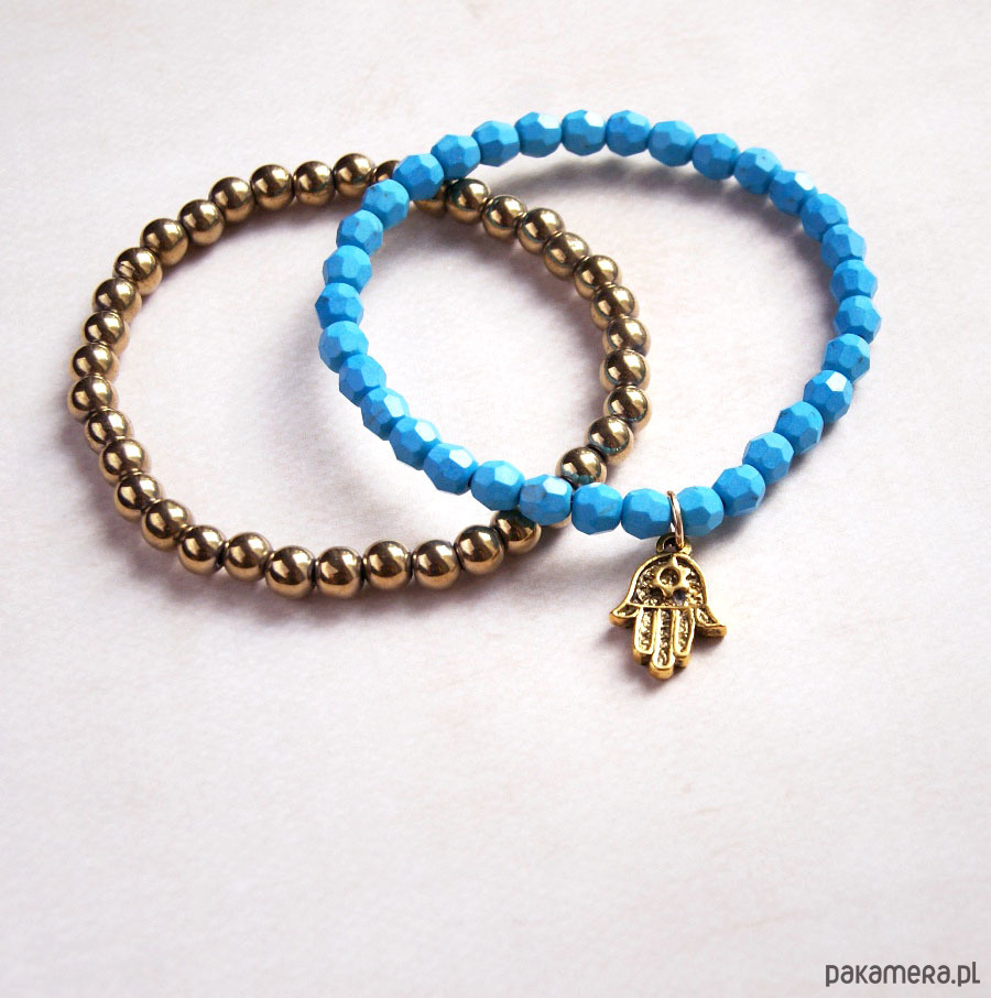 bransoletki na solidnej lince elastycznej, 1 wykonana z pięknego , fasetowanego howlitu turkusowego, druga ze złotego hematytu (kuleczki 6mm) ; zawieszka - hamsa