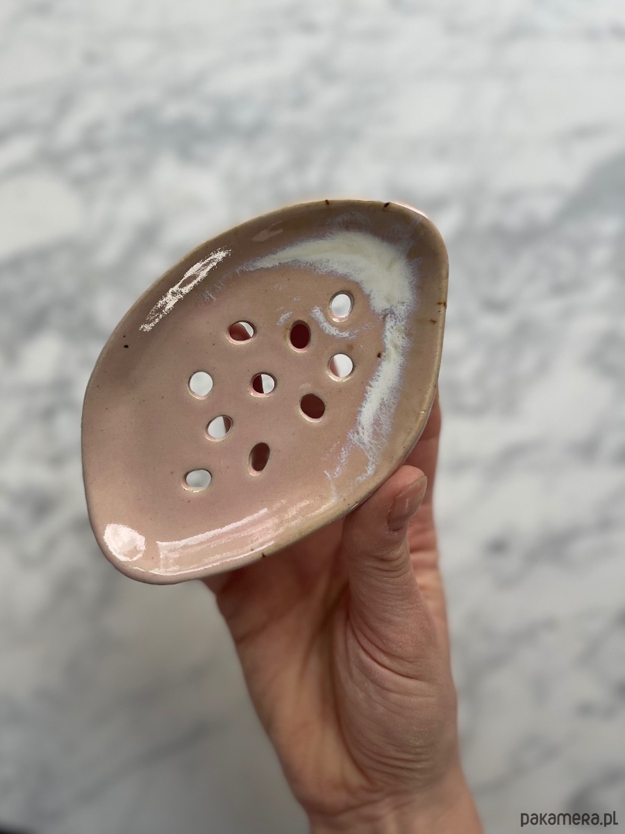 Gliniana mydelniczka o nieregularnych kształtach.