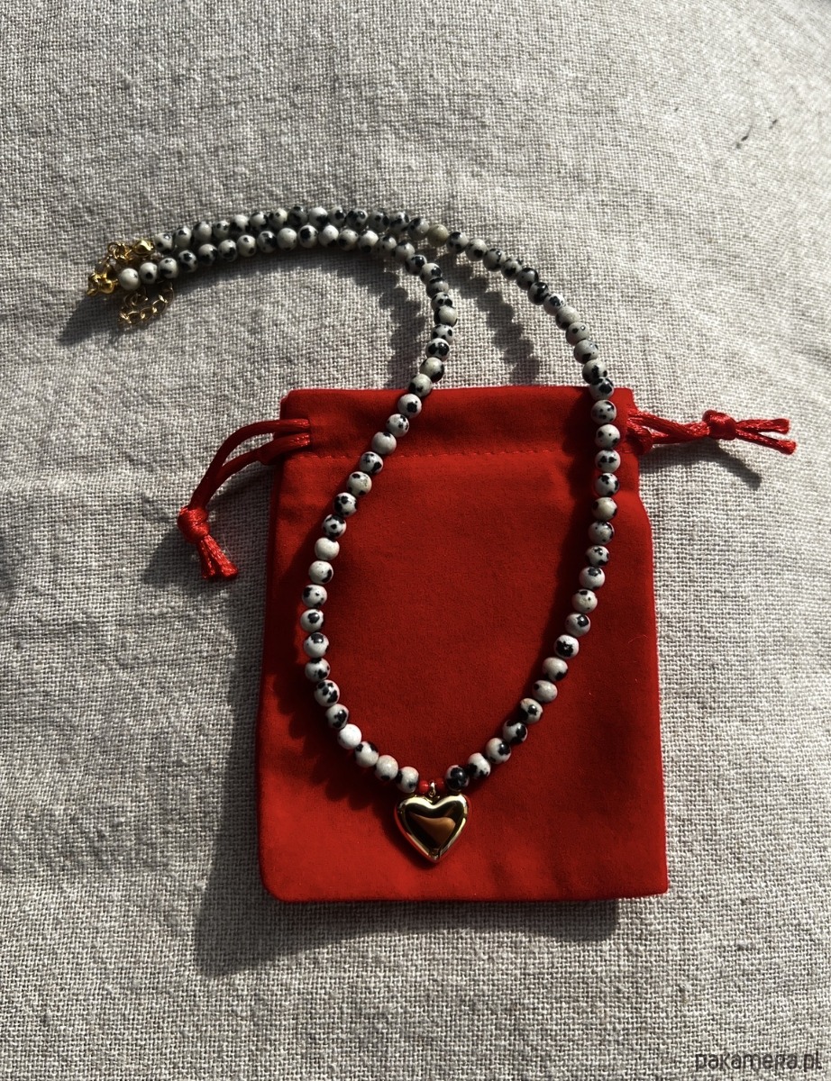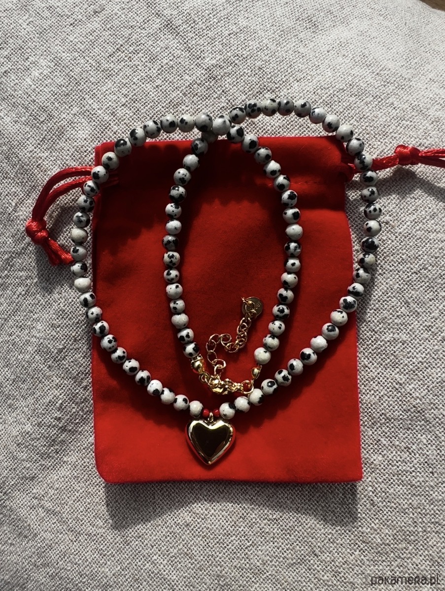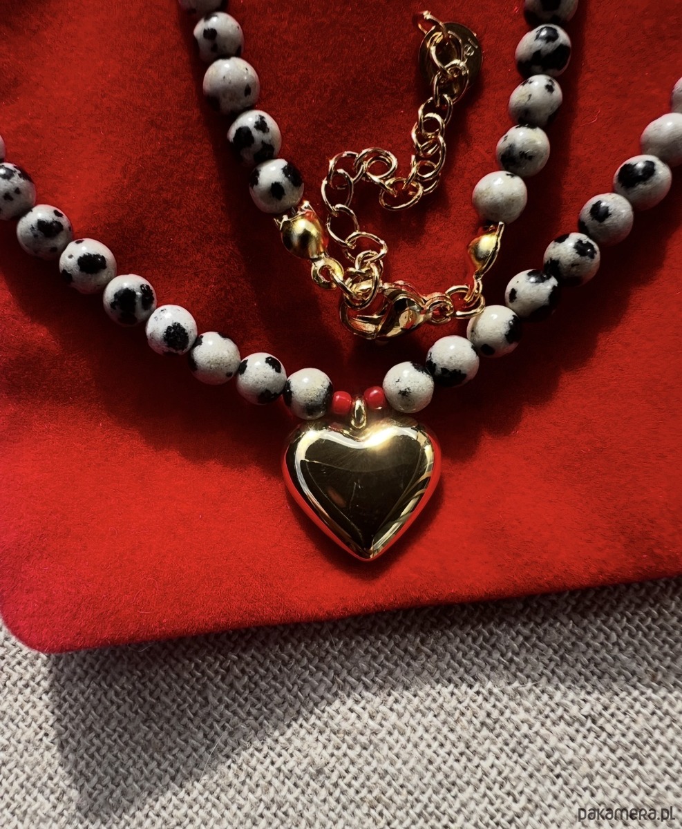 Naszyjnik z jaspisu dalmatyńskiego z serduszkiem ze stali szlachetnej w kolorze złotym.