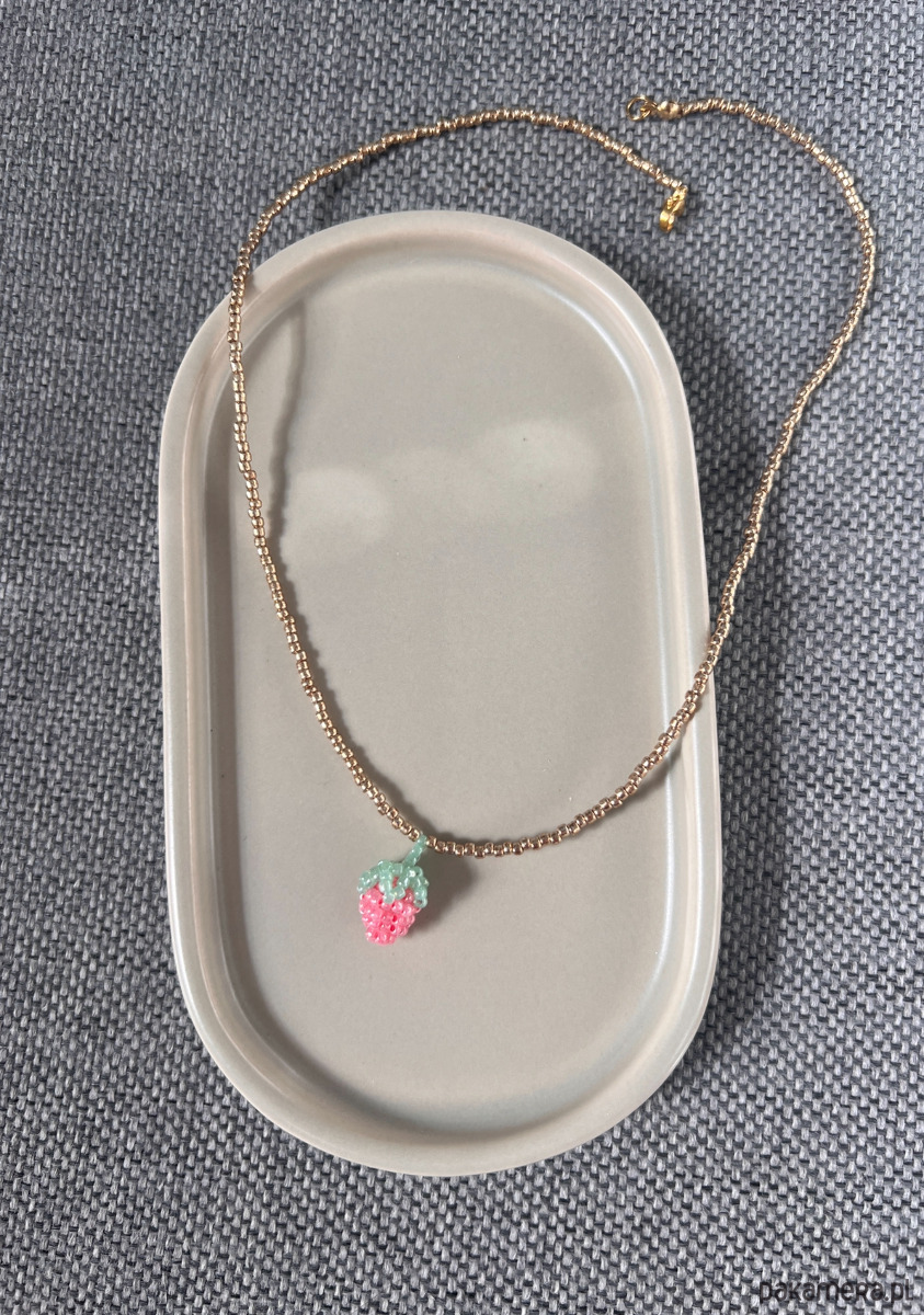 Handmade naszyjnik z koralików z plecionym owocem malinką