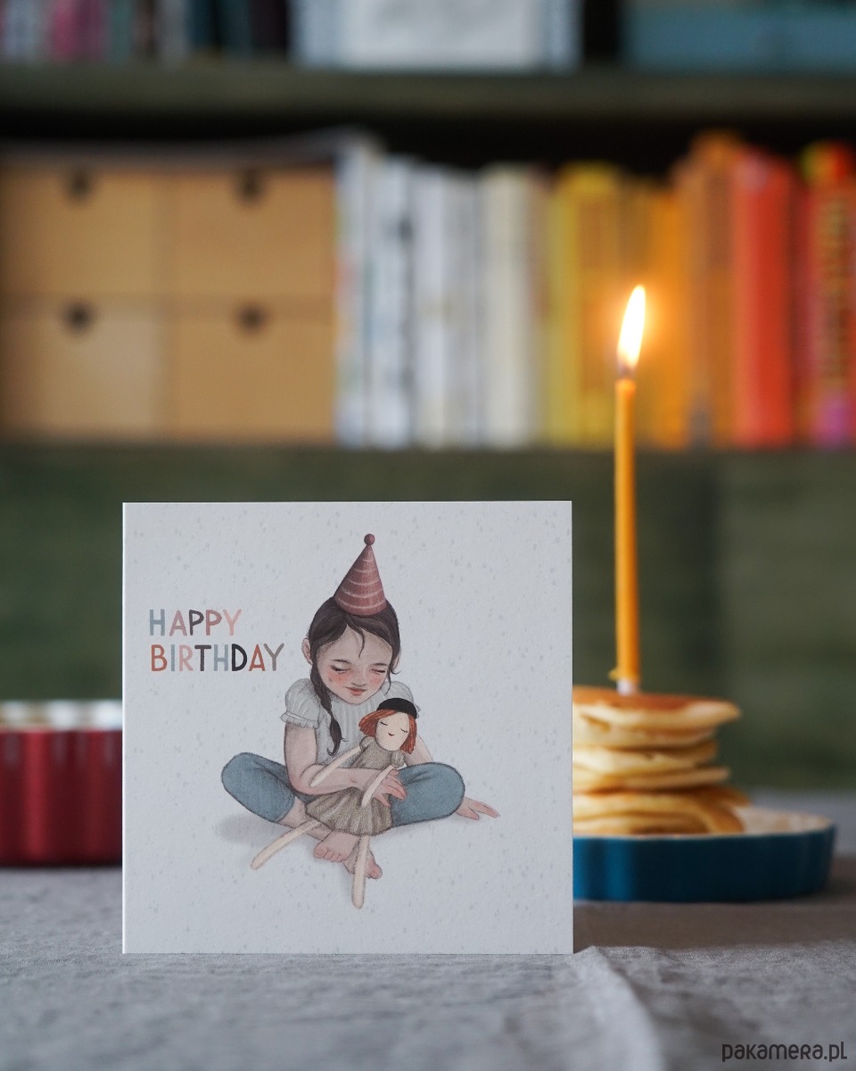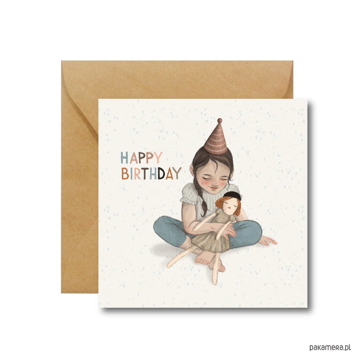 Świętuj urodziny dziewczynki z wyjątkową kartką od Hi Little. Dziewczynka świętuje urodziny wraz z piękną lalką od Maridolls.