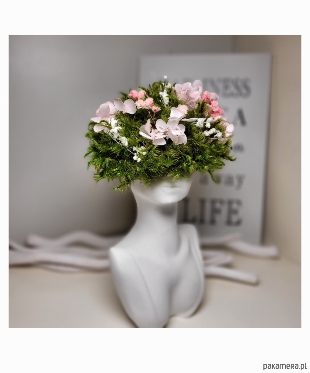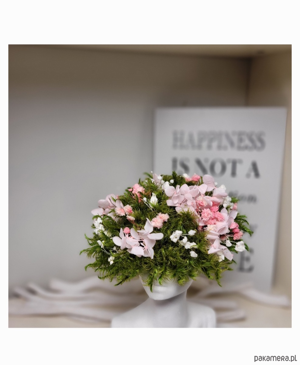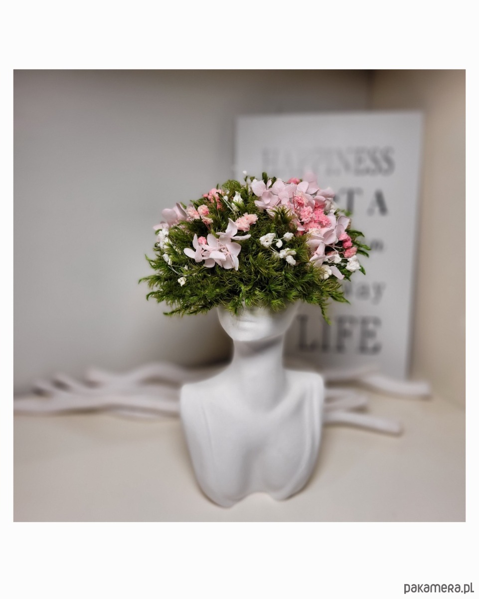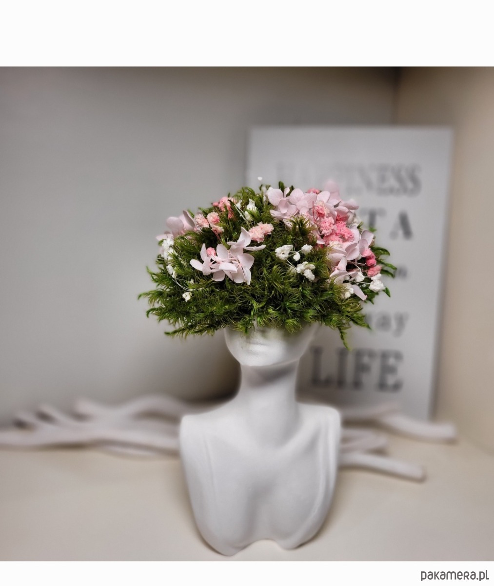 Eleganckie popiersie z gipsu w połączeniu z delikatną kompozycją ze stabilizowanego mchu i suszonych kwiatów tworzy harmonię natury i minimalizmu.