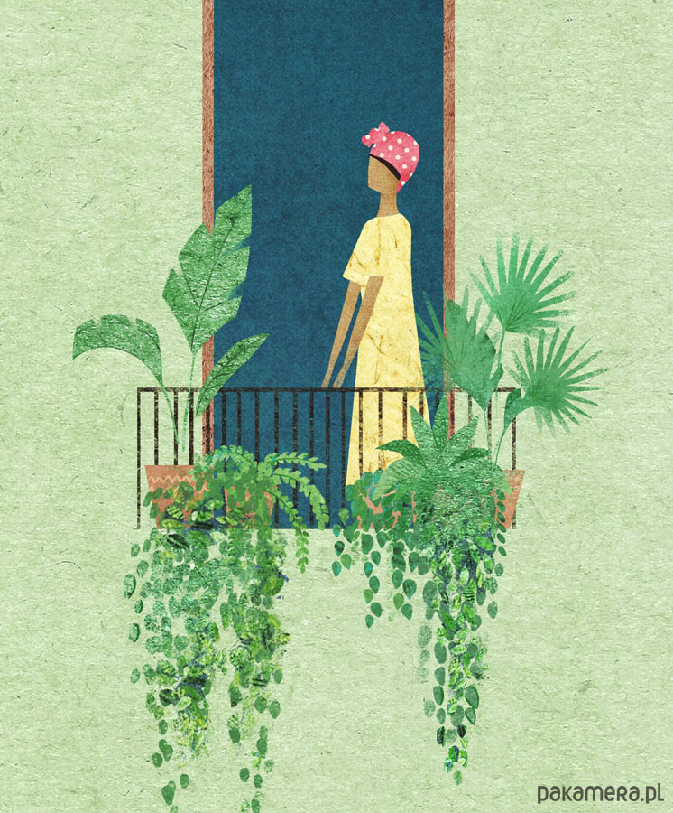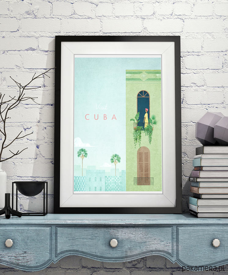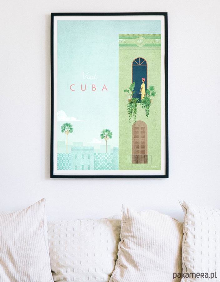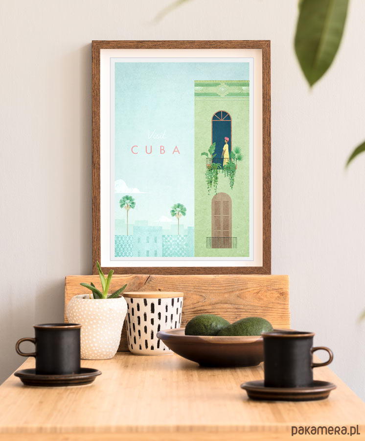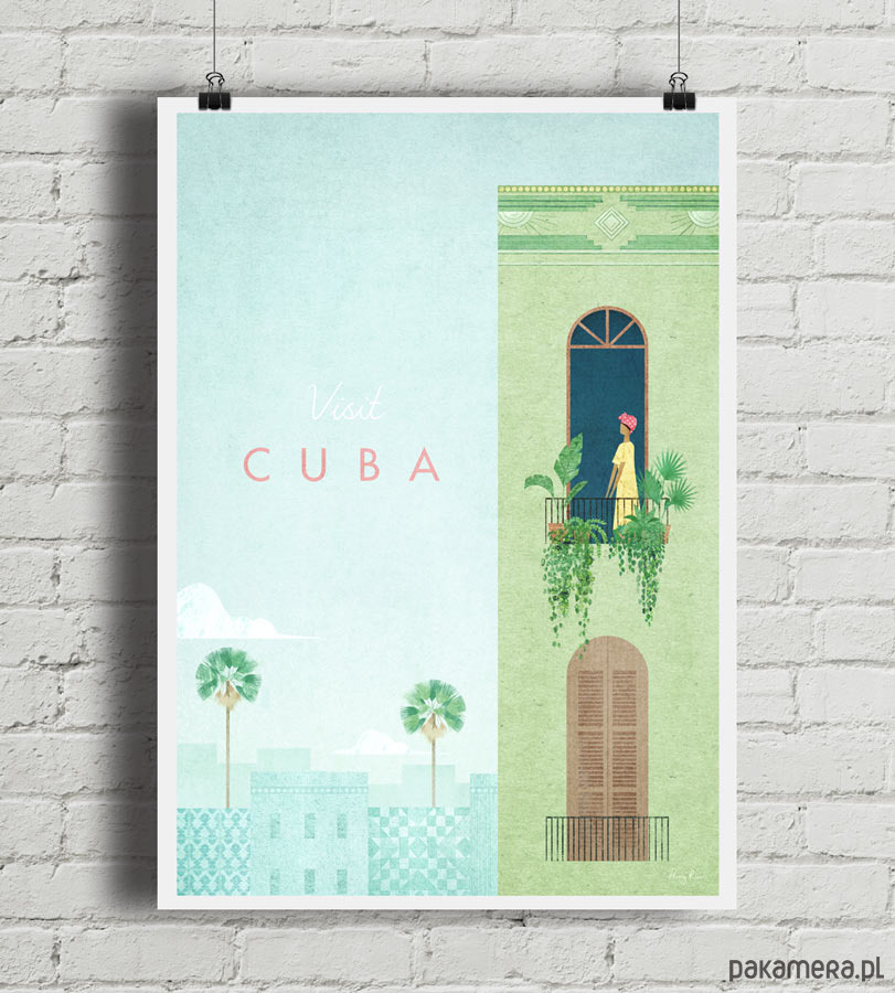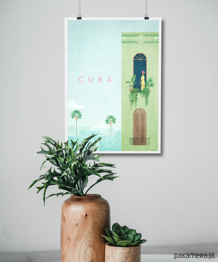 Plakat w stylu vintage przedstawiający Hawanę na Kubie. Na pierwszym planie widnieje dziewczyna stojącą w oknie balkonu swego mieszkania, balkon wypełniają tropikalne rośliny. W oddali roztacza się architektura Hawany z charakterystycznymi budynkami w stylu Art Deco. Grafika inspirowana plakatami podróżniczymi z lat 20-tych XX wieku.