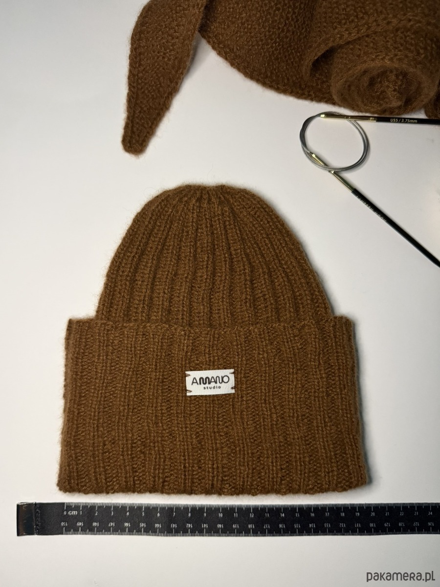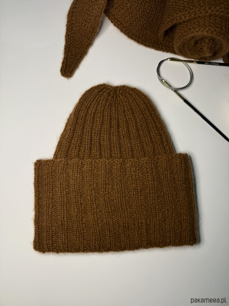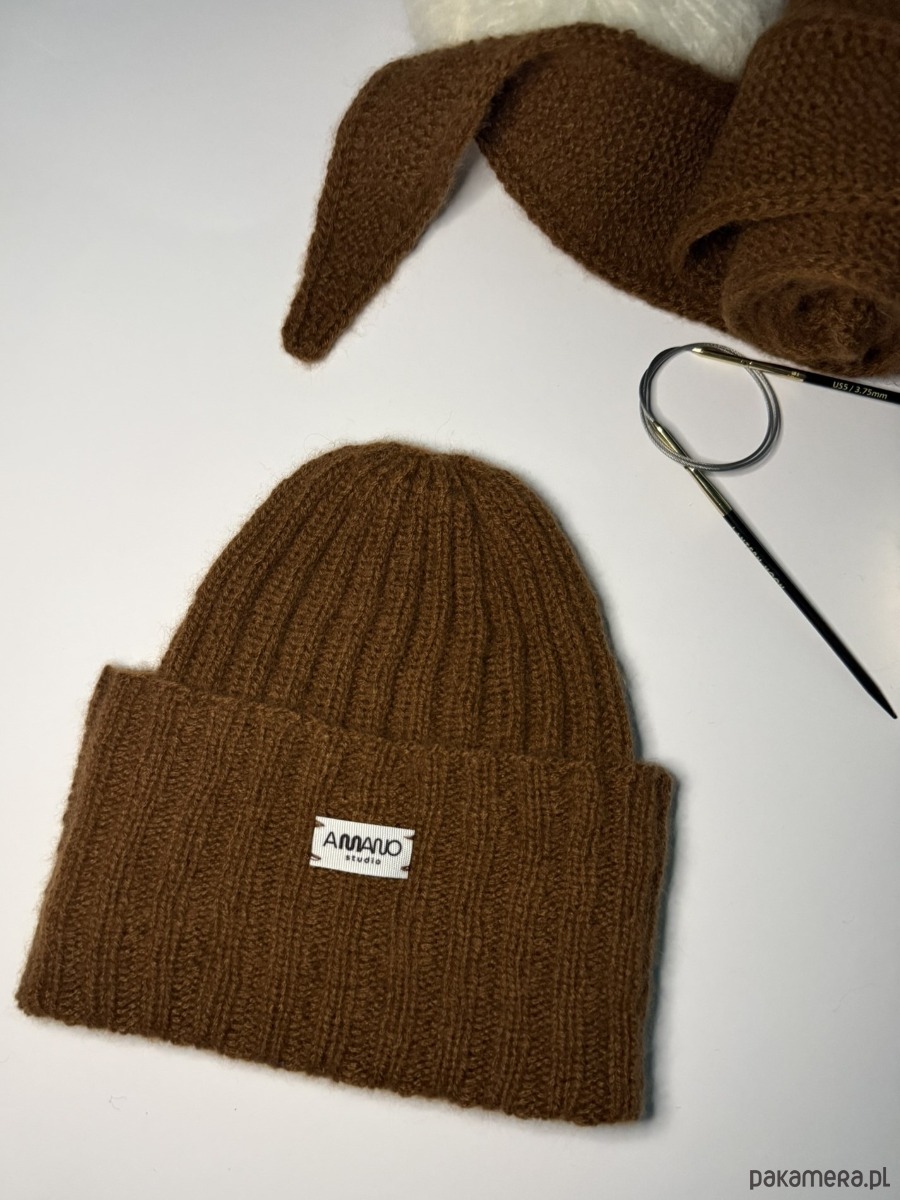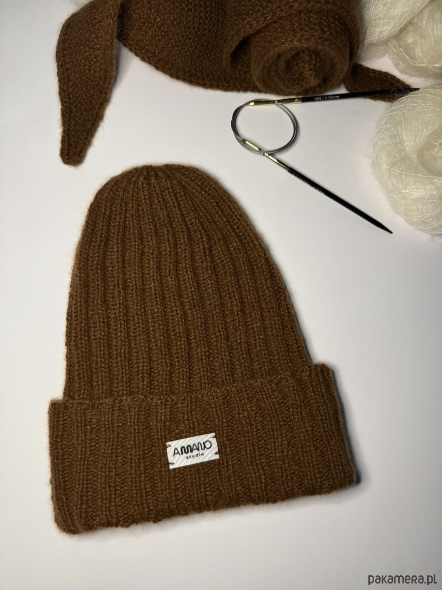 Czapka wykonana na drutach z włóczki w kolorze orzecha laskowego. Skład włóczki to 100% kaszmir. Czapka jest mięciutka, puchata i bardzo przyjemna w dotyku.