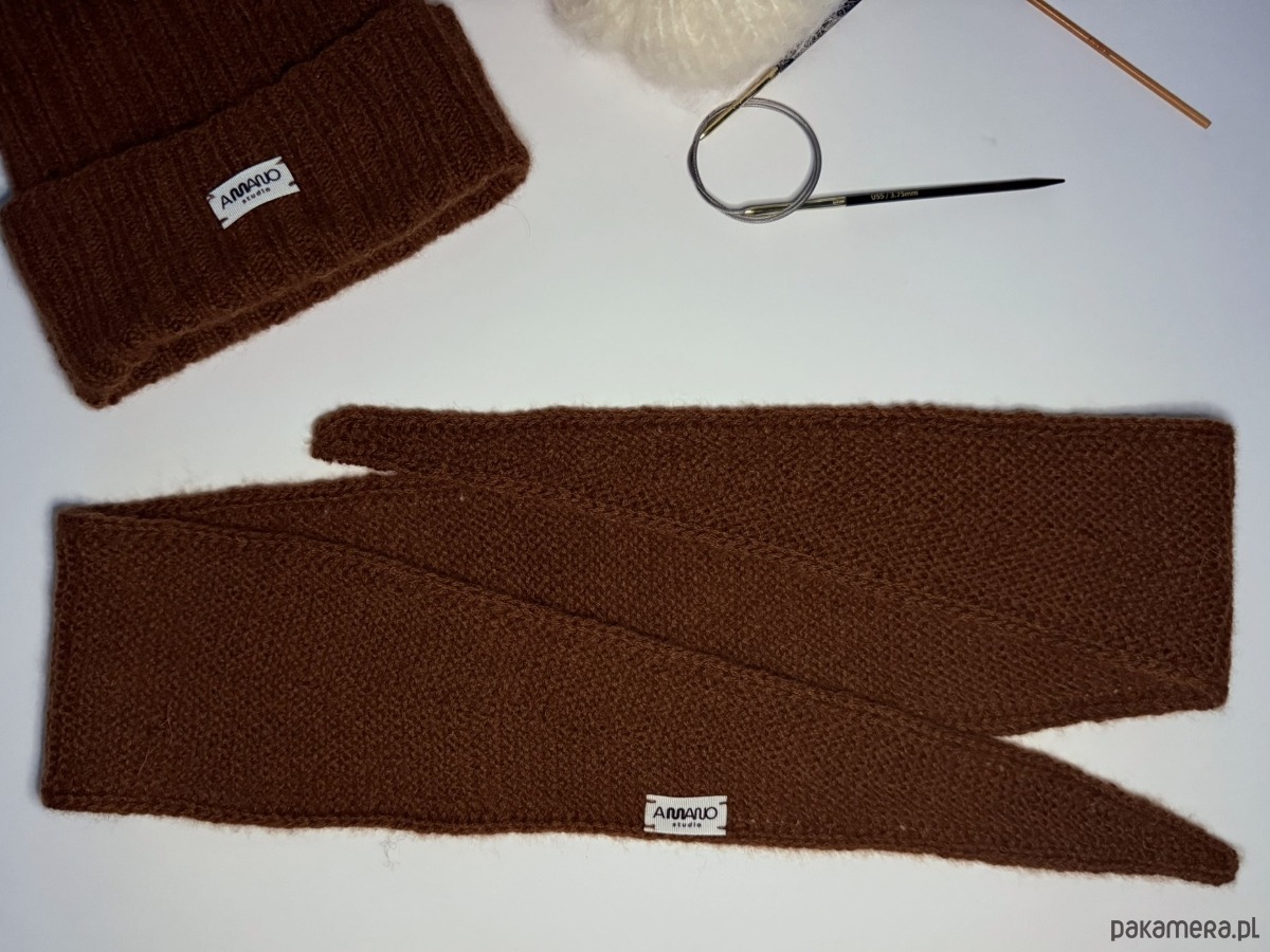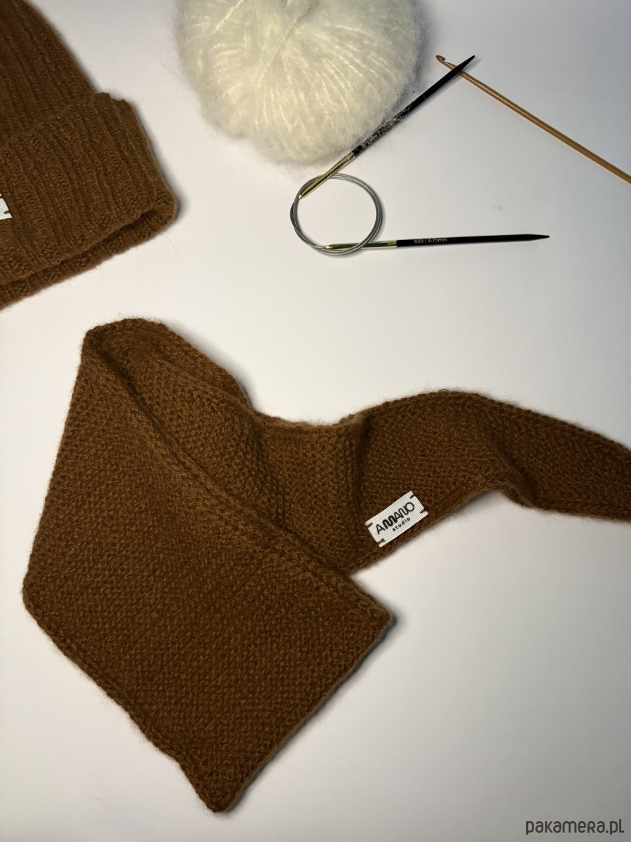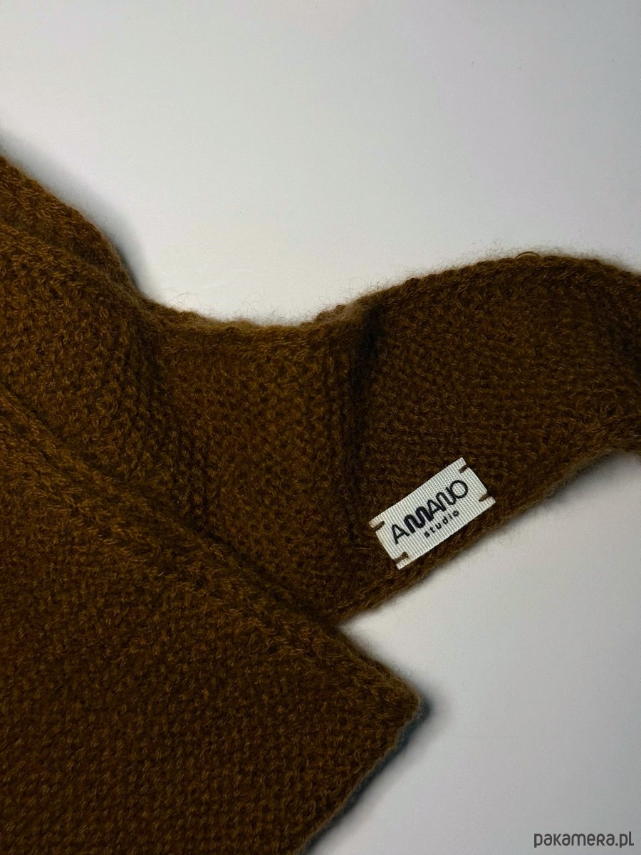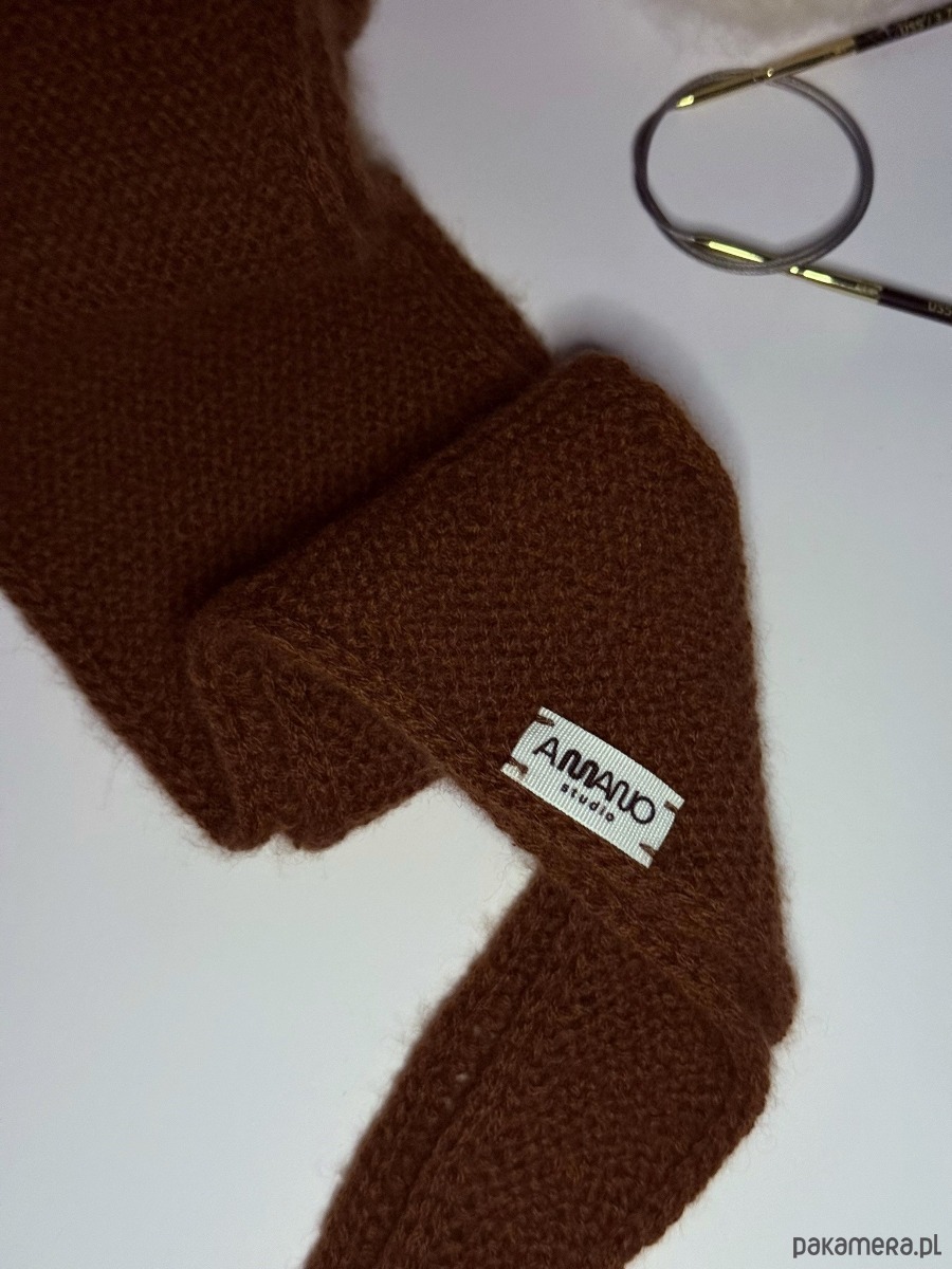 Szaliczek/apaszka wykonana na drutach z włóczki w kolorze orzecha laskowego. Skład włóczki to 100% kaszmir. Szaliczek jest mięciutki, puchaty i bardzo przyjemny w dotyku.