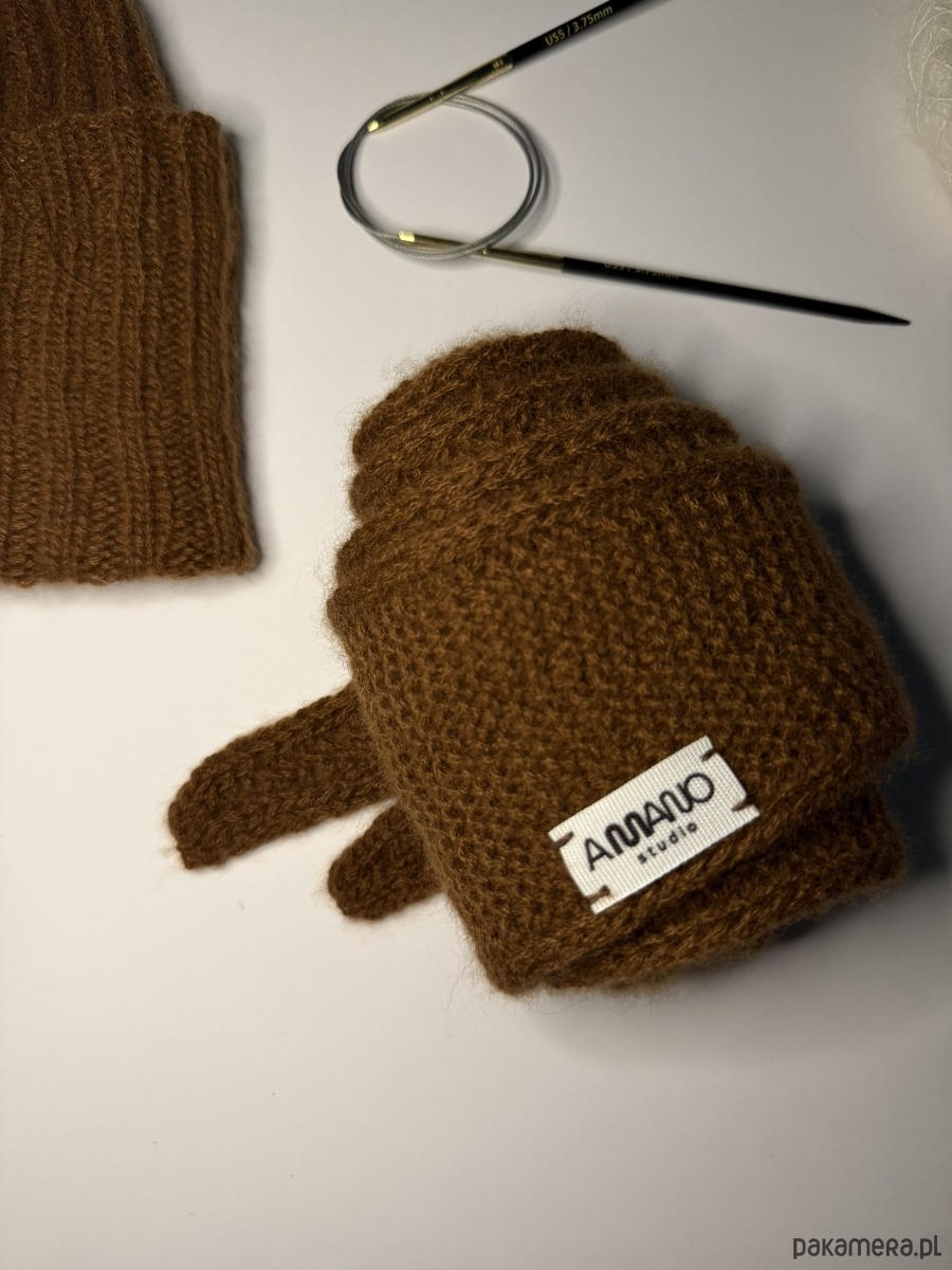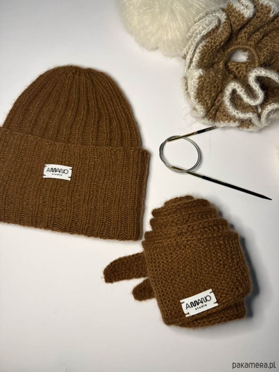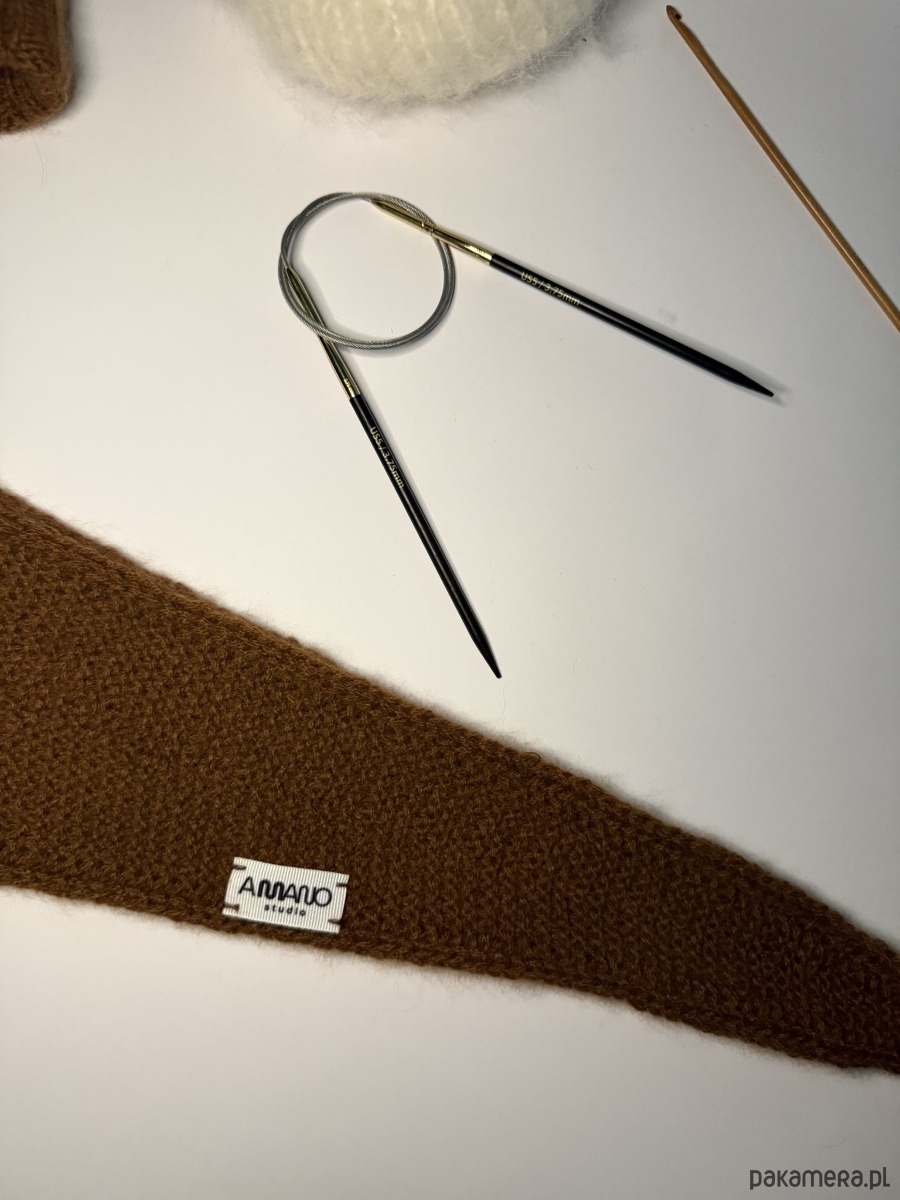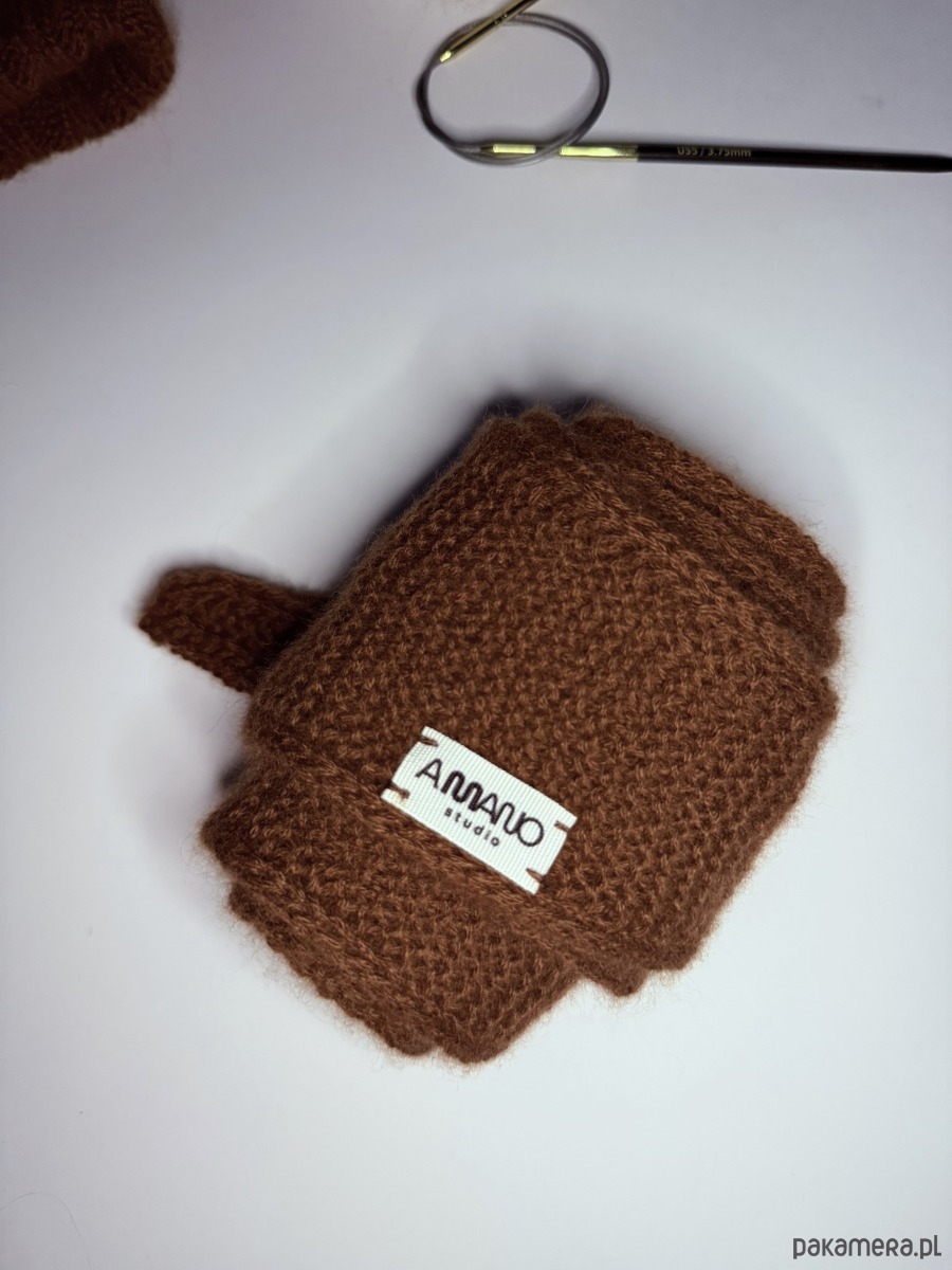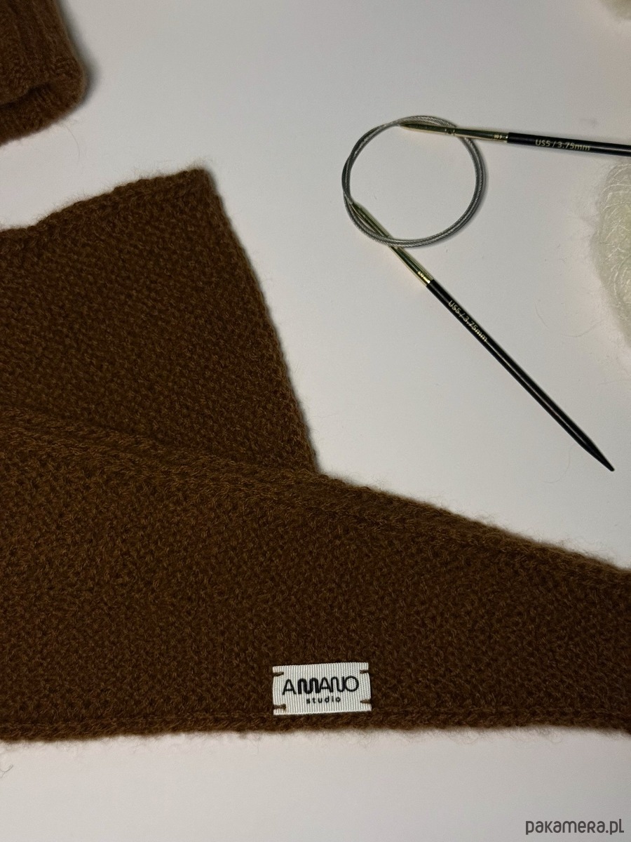Szaliczek/apaszka wykonana na drutach z włóczki w kolorze orzecha laskowego. Skład włóczki to 100% kaszmir. Szaliczek jest mięciutki, puchaty i bardzo przyjemny w dotyku.