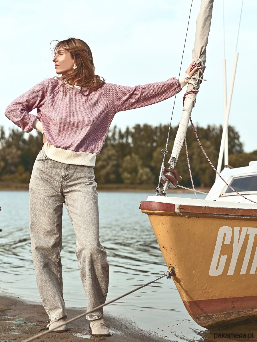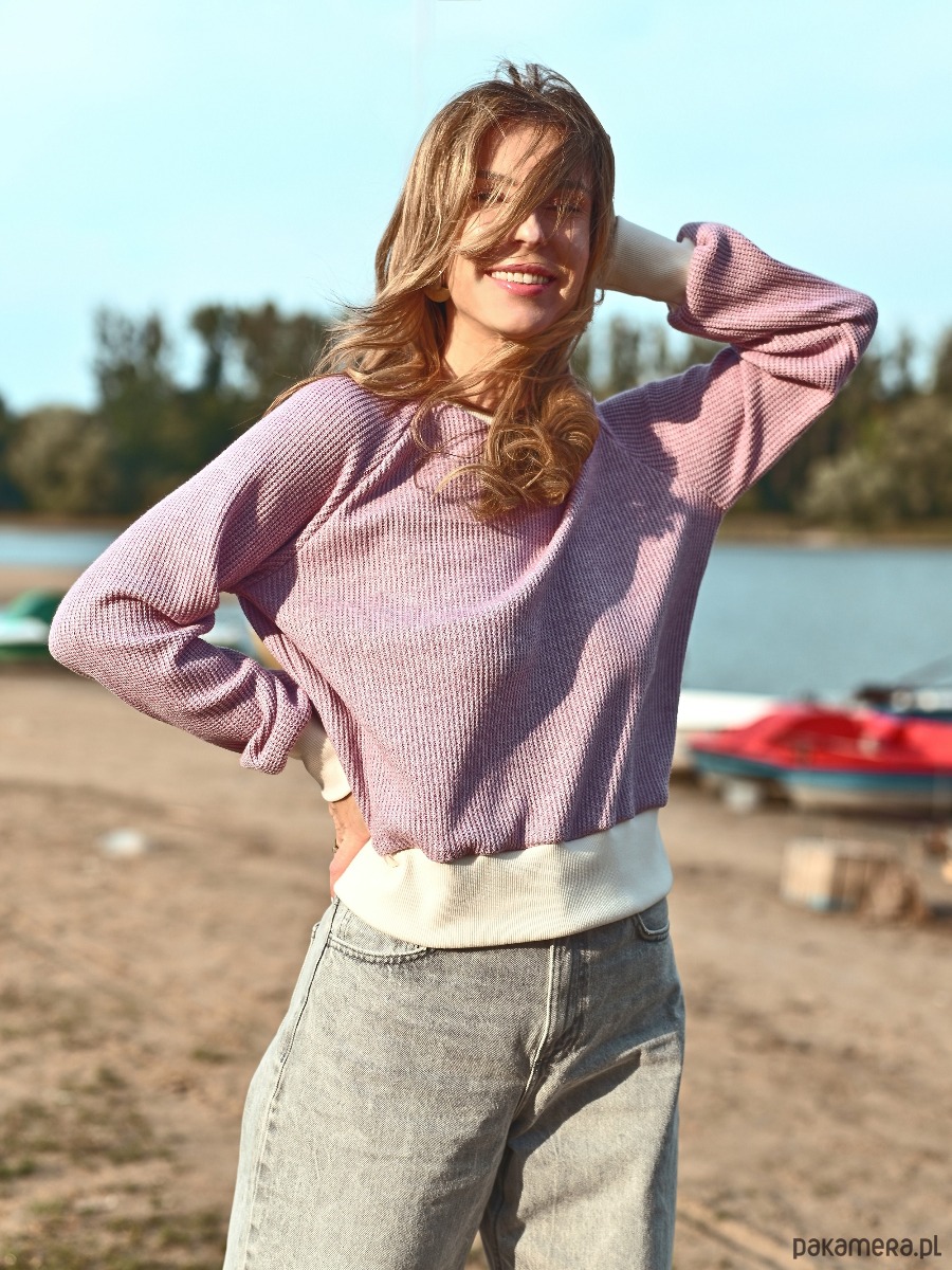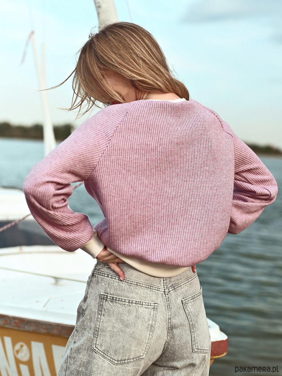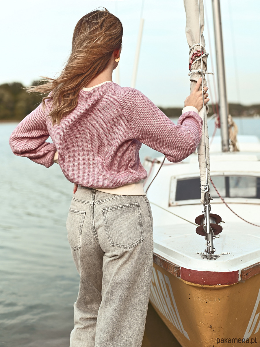 Charakteryzuje się także wygodnym, raglanowym krojem, luźnymi rękawami wykończonymi węższymi mankietami i grubym, solidnym splotem o niebanalnym kolorze. Jest ciepły i bardzo miękki.