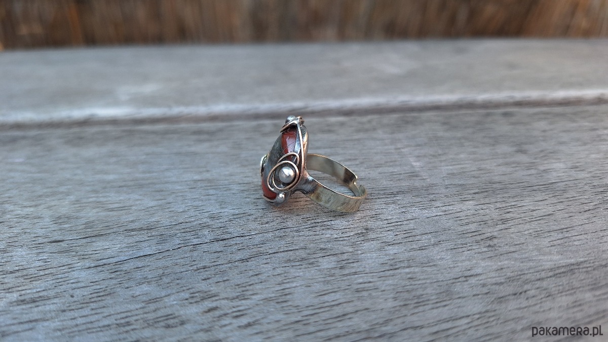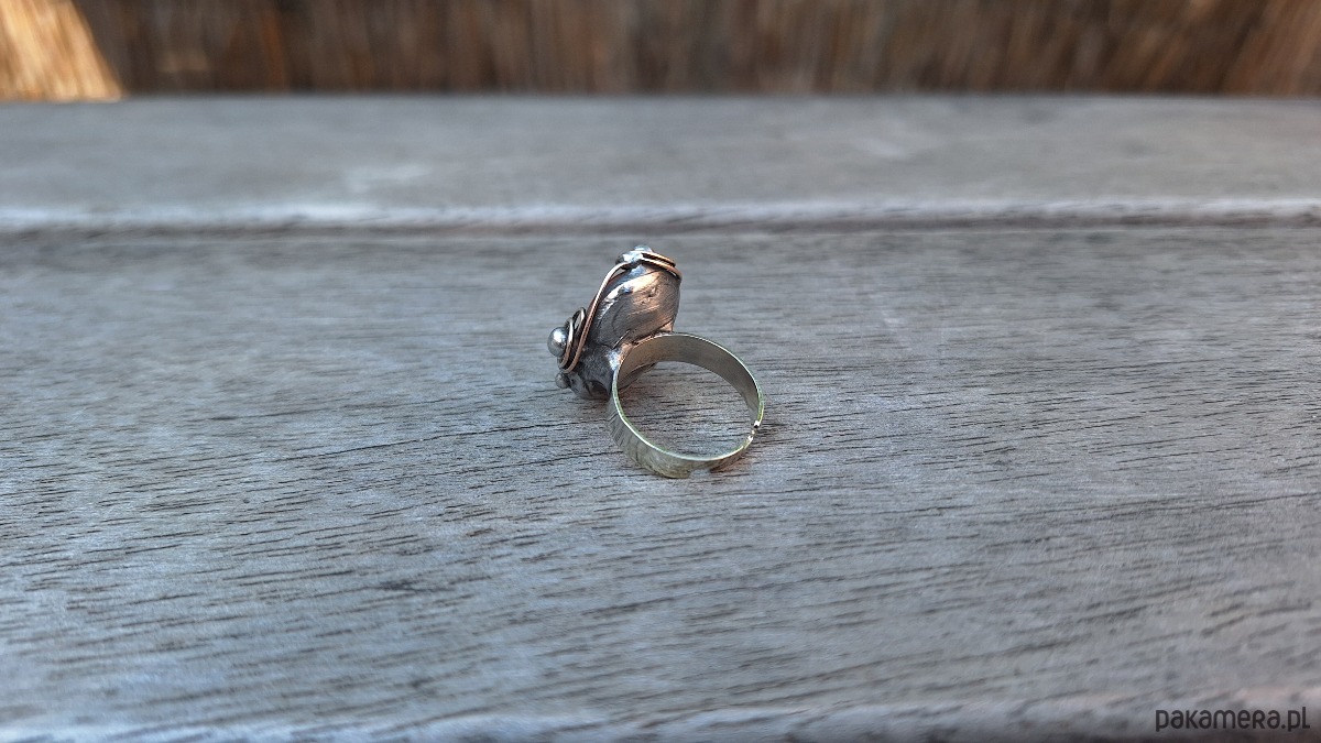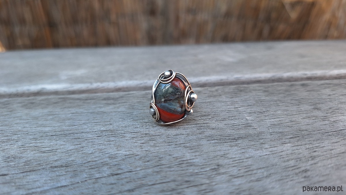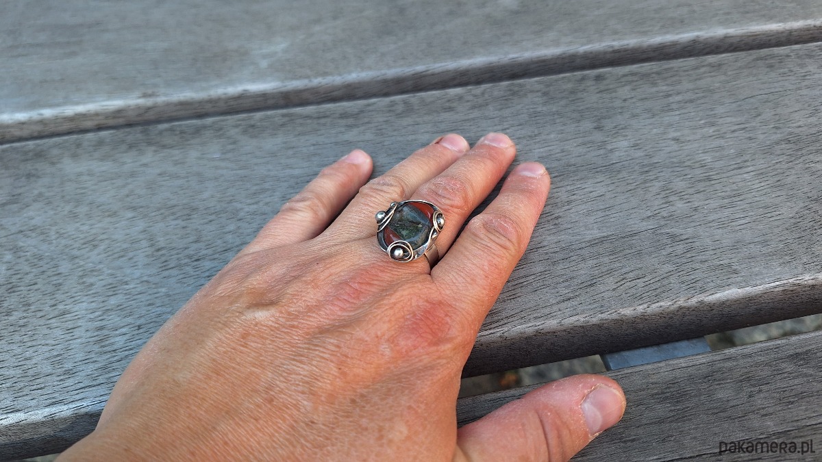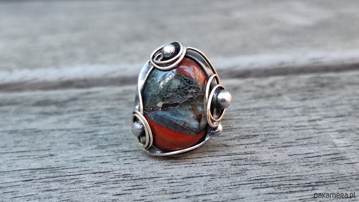 Pierścionek wykonany z miedzi, cyny i heliotropu. Wymiary ok. 2 na 1.5 cm. Regulowany. Nie jest ciężki.