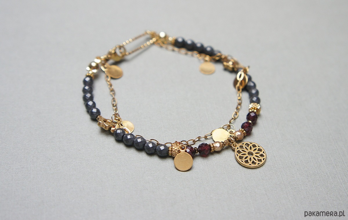Delikatna bransoletka wykonana w całości ze stali szlachetnej pozłacanej oraz naturalnych kamieni - hematytu fasetowanego, matowego 4mm], fasetowanych kuleczek granatu [4mm], hematytu fasetowanego, platerowanego [3mm], przekładek z hematytu [1mm], kwiatków z hematytu [6mm]. Całkowita długość bransoletki: ok. 18,8cm. Biżuteria ozdobnie zapakowana.