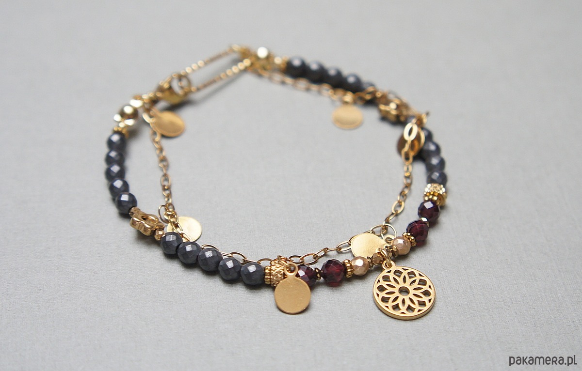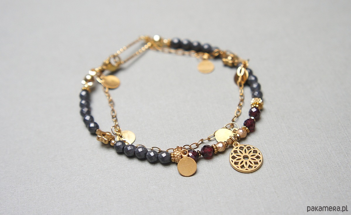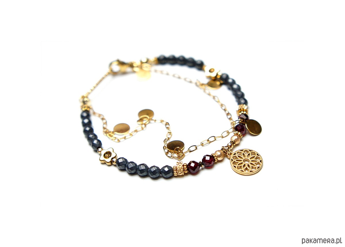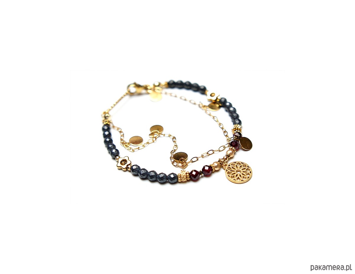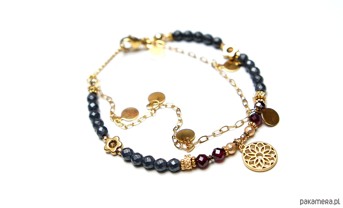 Delikatna bransoletka wykonana w całości ze stali szlachetnej pozłacanej oraz naturalnych kamieni - hematytu fasetowanego, matowego 4mm], fasetowanych kuleczek granatu [4mm], hematytu fasetowanego, platerowanego [3mm], przekładek z hematytu [1mm], kwiatków z hematytu [6mm]. Całkowita długość bransoletki: ok. 18,8cm. Biżuteria ozdobnie zapakowana.