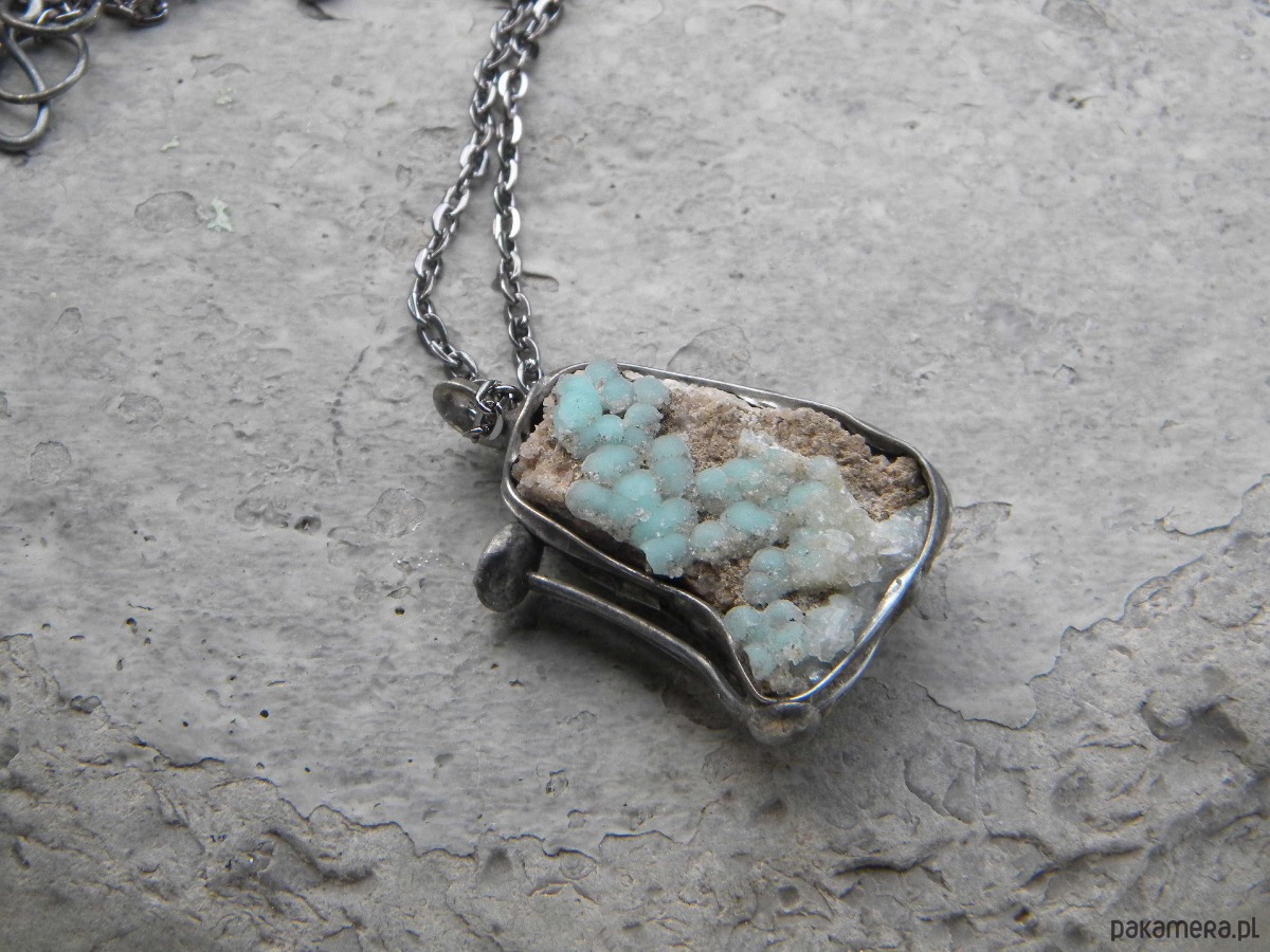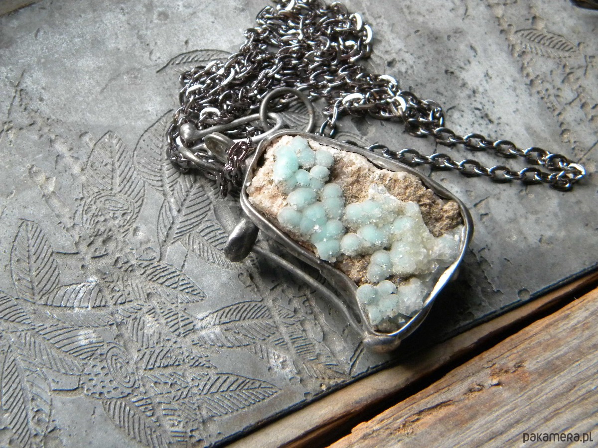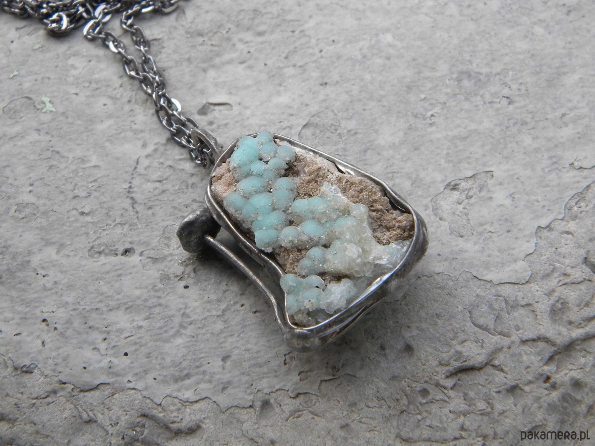 kryształy hemimorfitu z fragmentem skały macierzystej w oprawie z ocynowanej miedzi