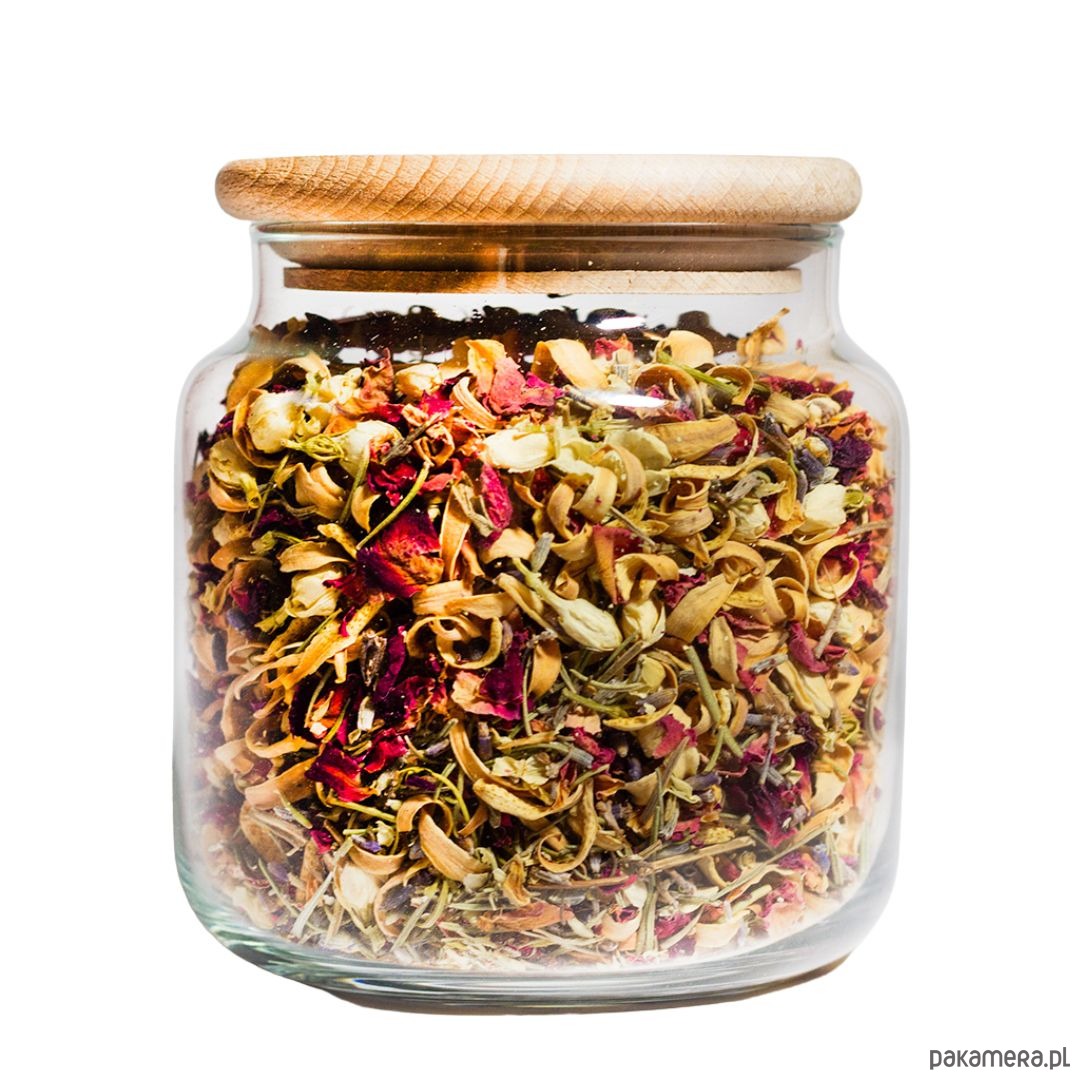 Herbatka Balans ciała skład : suszone płatki róży, pomarańczy, jaśminu, lawenda, rozmaryn, olejek różany i eukaliptusowy