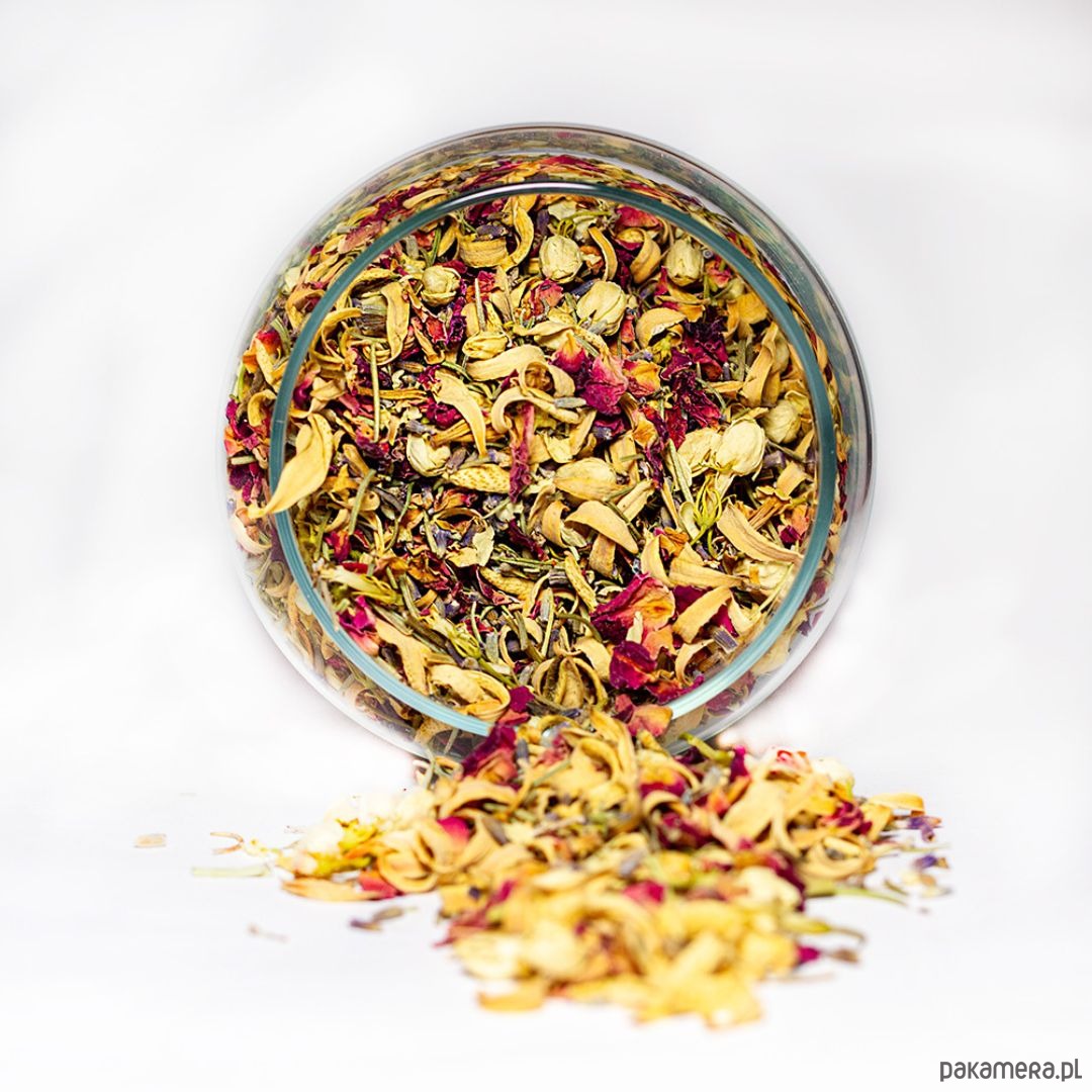 Herbatka kąpielowa zawiera 5 rodzajów suszonych kwiatów i ziół dzięki czemu dodana do kąpieli odżywia i zmiękcza naskórek jednocześnie zapewnia pełen relaks.