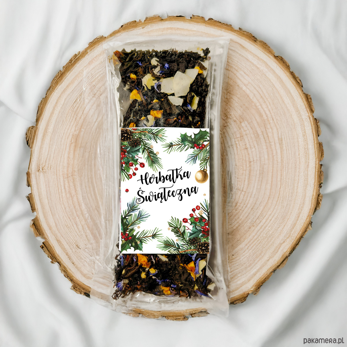 W przezroczystym opakowaniu widać kolorową mieszankę pełną suszonej skórki pomarańczy, płatków kwiatów, jabłka i przypraw korzennych. Każdy łyk tej herbaty to połączenie słodyczy, cytrusowej świeżości i delikatnej nuty cynamonu. Etykieta ozdobiona świątecznymi gałązkami, czerwonymi jagodami i złotą bombką sprawia, że produkt prezentuje się niezwykle elegancko – idealny jako prezent świąteczny dla bliskiej osoby.