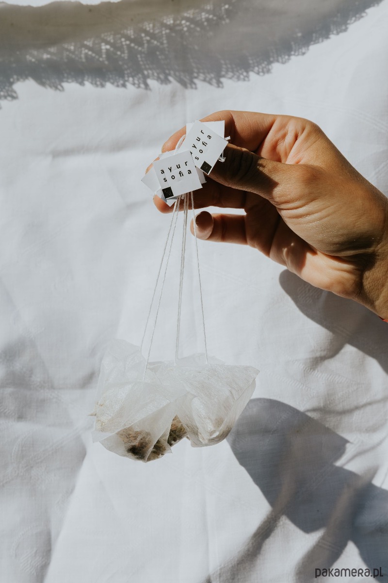pudełko a w środku 20 sztuk BIODEGRADOWALNYCH, PAPIEROWYCH, RĘCZNIE PAKOWANYCH torebeczek (40g netto)