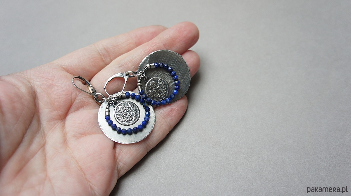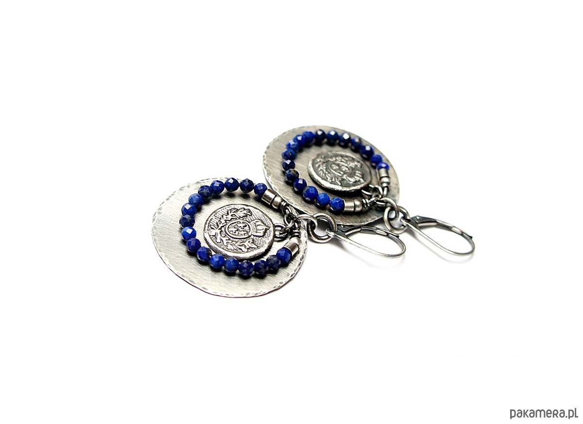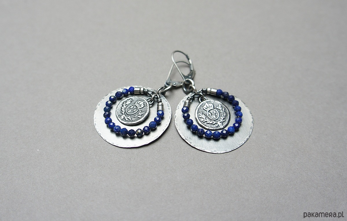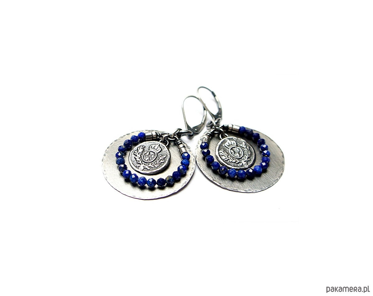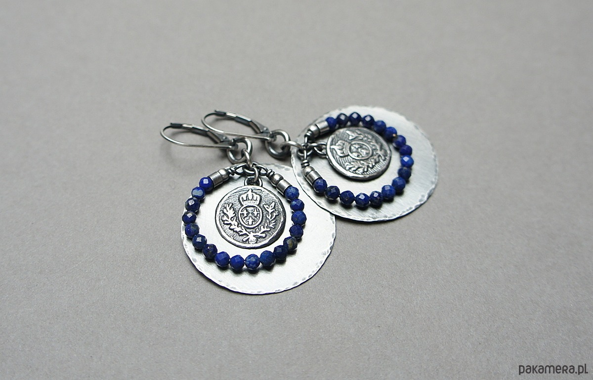 Kolczyki wykonane w całości własnoręcznie od podstaw ze srebra [pr. 925 i 930]. Srebrne tarcze [ śr. 29mm] ,herby [13mm]oraz fasetowane kuleczki lapis lazuli [3mm] . Srebro oksydowane i przetarte. Całkowita długość kolczyków 5 cm. Biżuteria ozdobnie zapakowana