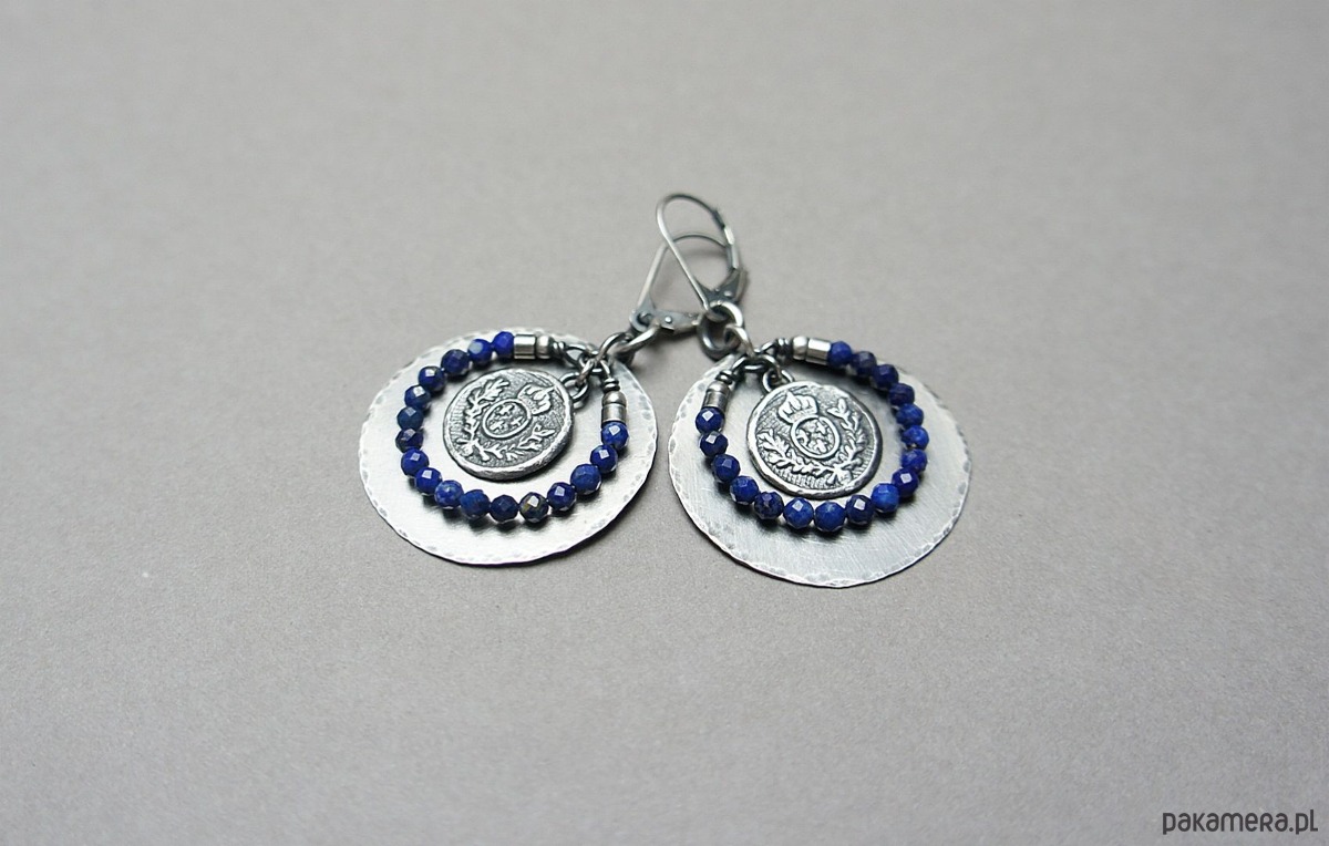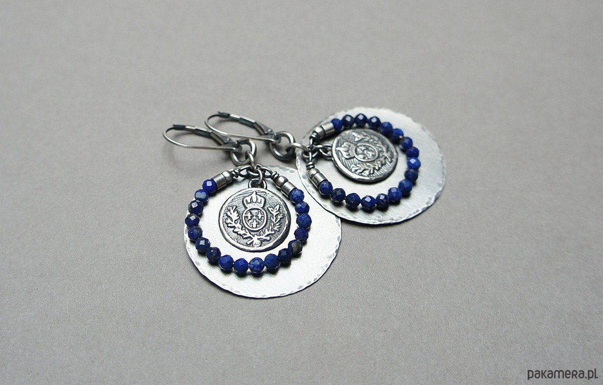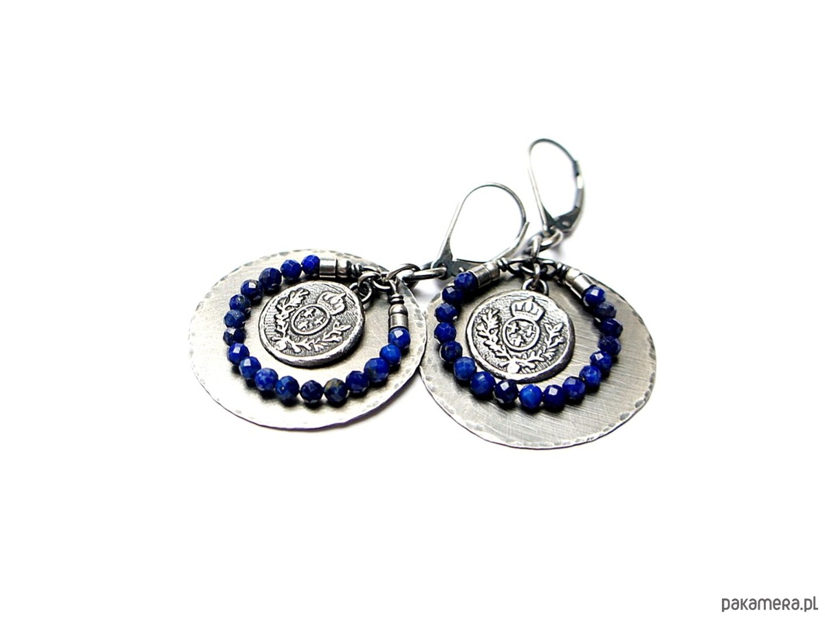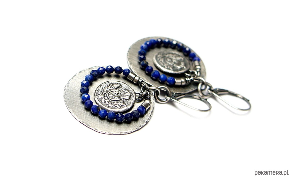 Kolczyki wykonane w całości własnoręcznie od podstaw ze srebra [pr. 925 i 930]. Srebrne tarcze [śr. 29mm] ,herby [13mm] oraz fasetowane kuleczki lapis lazuli [3mm]. Srebro oksydowane i przetarte. Całkowita długość kolczyków 5 cm. Biżuteria ozdobnie zapakowana .