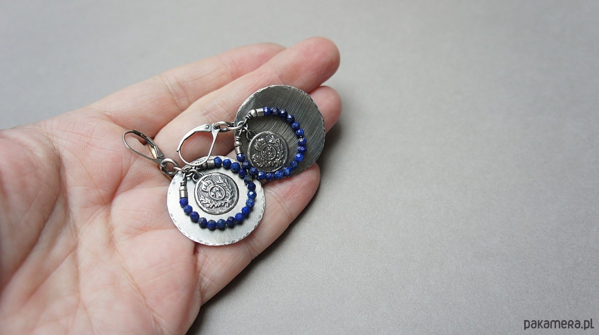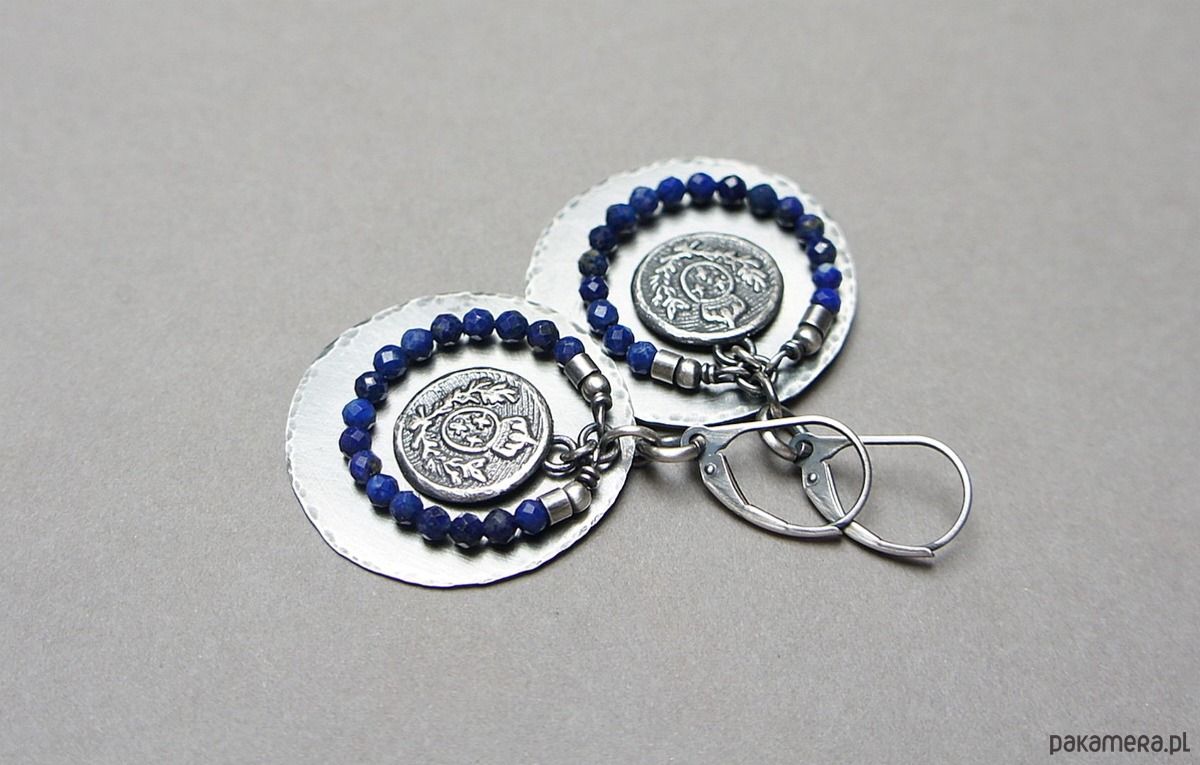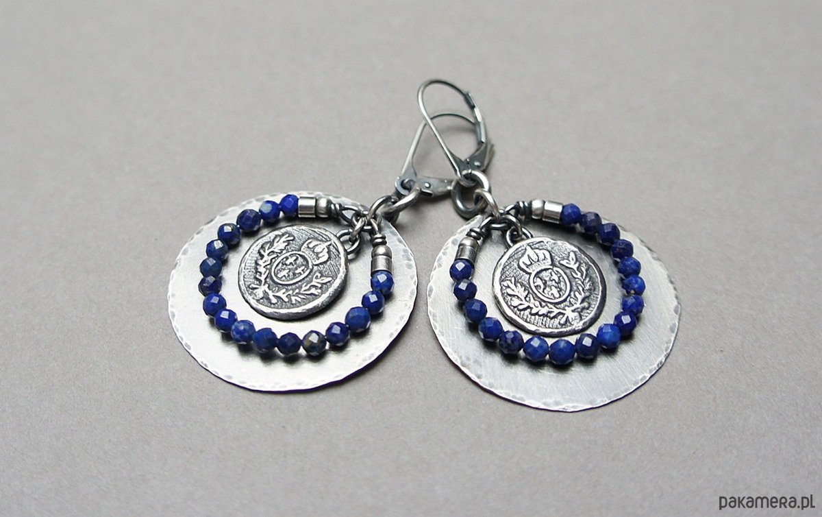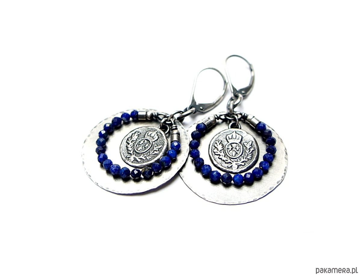 Kolczyki wykonane w całości własnoręcznie od podstaw ze srebra [pr. 925 i 930]. Srebrne tarcze [śr. 29mm] ,herby [13mm] oraz fasetowane kuleczki lapis lazuli [3mm]. Srebro oksydowane i przetarte. Całkowita długość kolczyków 5 cm. Biżuteria ozdobnie zapakowana .
