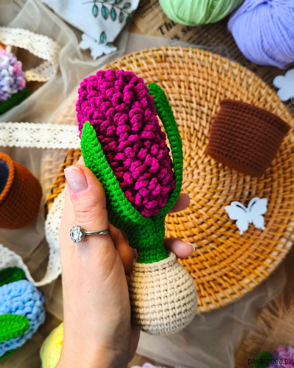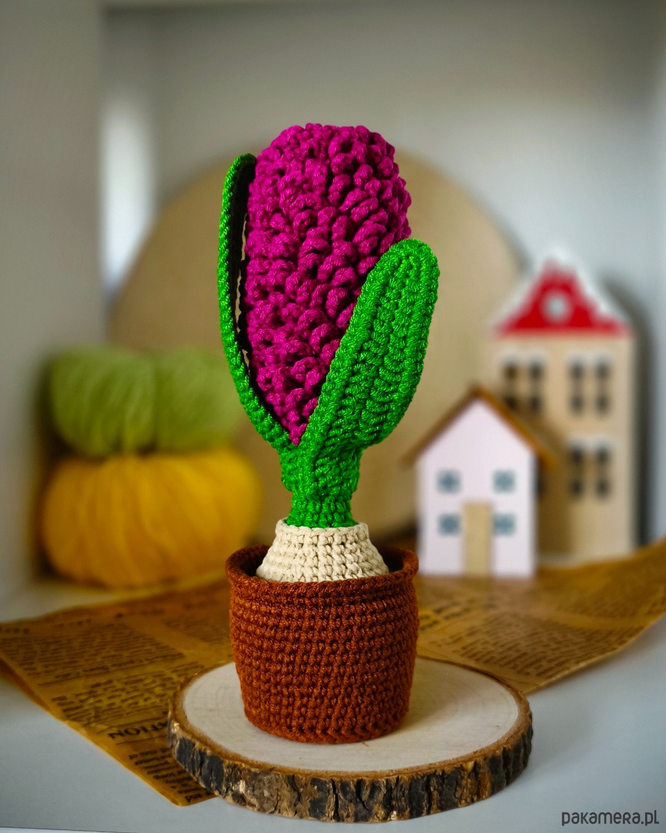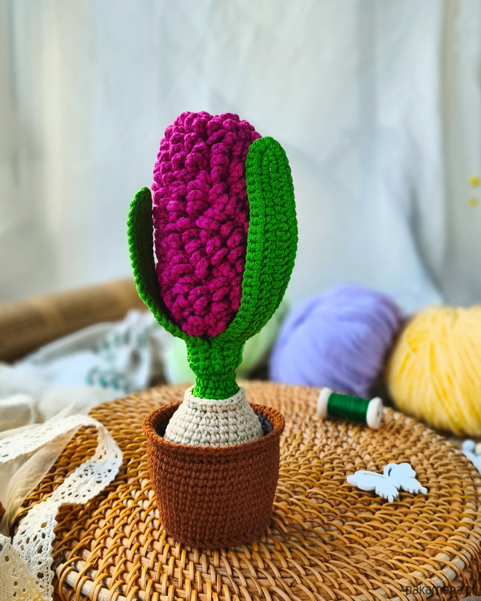 Uroczy hiacynt wykonany na szydełku to wyjątkowa ozdoba, która wprowadzi do wnętrza wiosenny klimat przez cały rok. Roślina umieszczona jest w szydełkowej doniczce, co nadaje jej przytulnego, naturalnego charakteru.