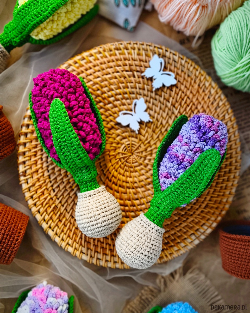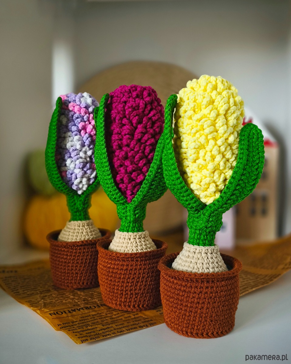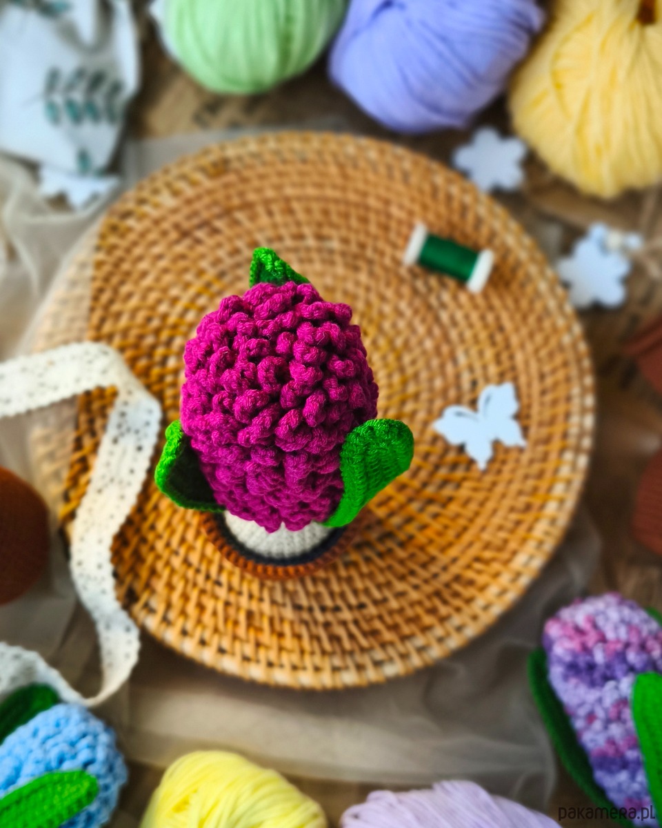 Uroczy hiacynt wykonany na szydełku to wyjątkowa ozdoba, która wprowadzi do wnętrza wiosenny klimat przez cały rok. Roślina umieszczona jest w szydełkowej doniczce, co nadaje jej przytulnego, naturalnego charakteru.