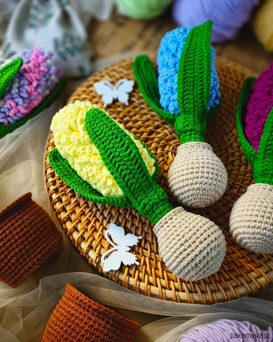 Uroczy hiacynt wykonany na szydełku to wyjątkowa ozdoba, która wprowadzi do wnętrza wiosenny klimat przez cały rok. Roślina umieszczona jest w szydełkowej doniczce, co nadaje jej przytulnego, naturalnego charakteru.