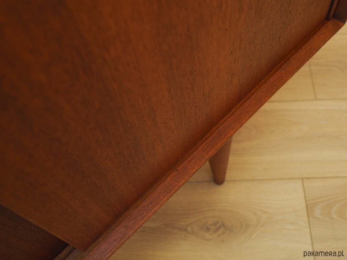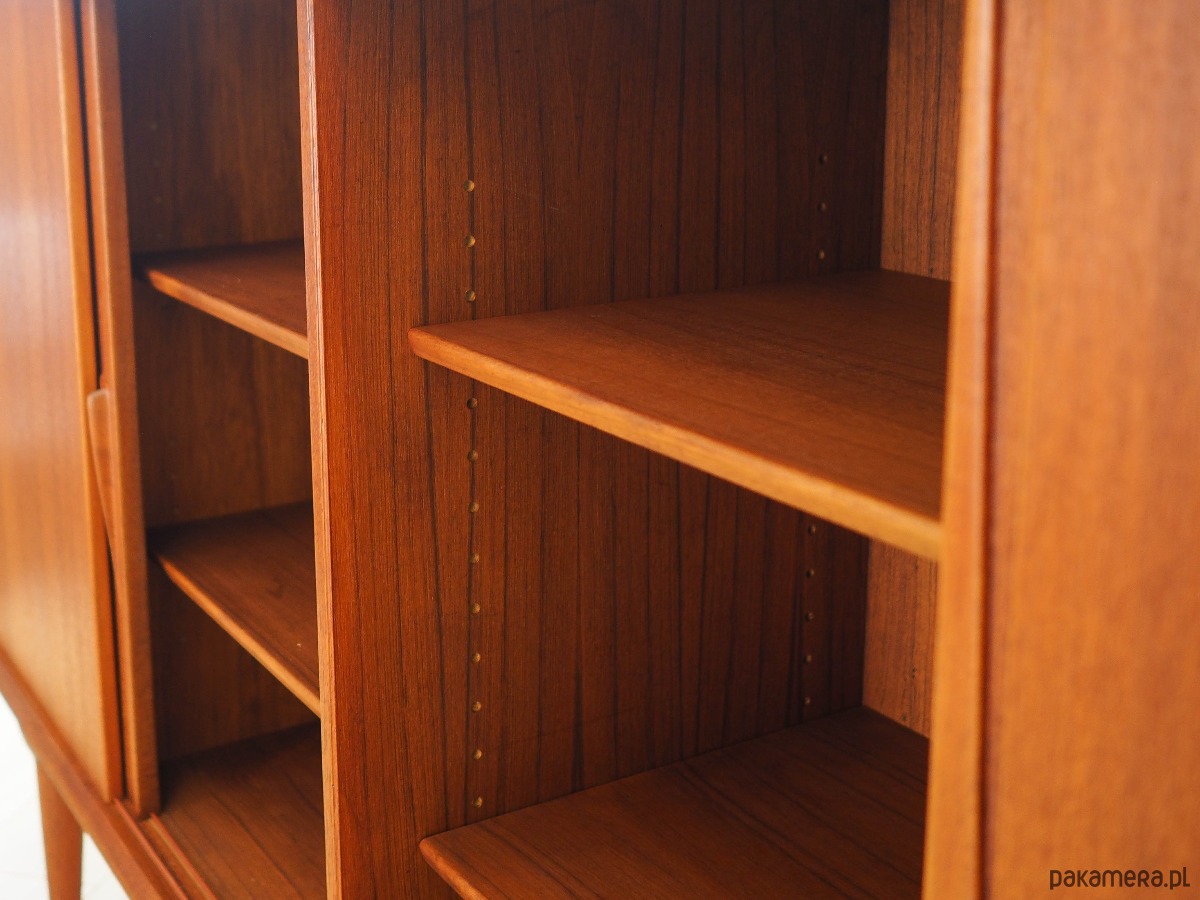 Konstrukcja pokryta jest fornirem tekowym. Nogi zostały wykonane z litego drewna. Powierzchnia po odświeżeniu. Wewnątrz przestrzeń została wypełniona czterema praktycznymi półkami oraz sześcioma szufladami. Zarówno półki, jak i szuflady, posiadają możliwość regulacji wysokości. Highboard posiada wygodne rozwiązanie drzwi przesuwnych, dzięki czemu ograniczamy konieczność pozostawienia dużej wolnej przestrzeni przed meblem, jednocześnie nie ograniczając sobie dostępu do jego wnętrza. Ponadto przesuwne drzwi są idealnym rozwiązaniem, aby wykorzystać mebel pod sprzęt audio.