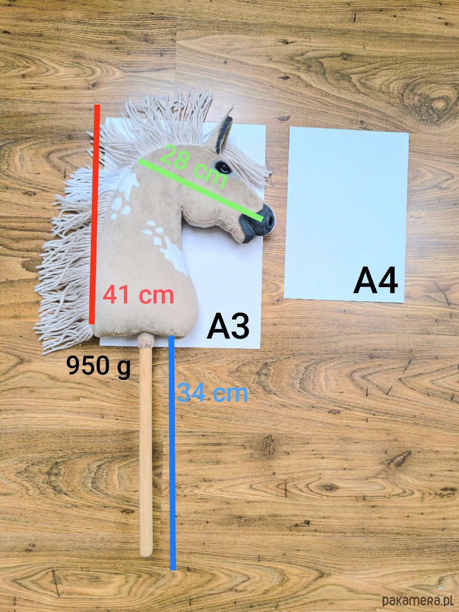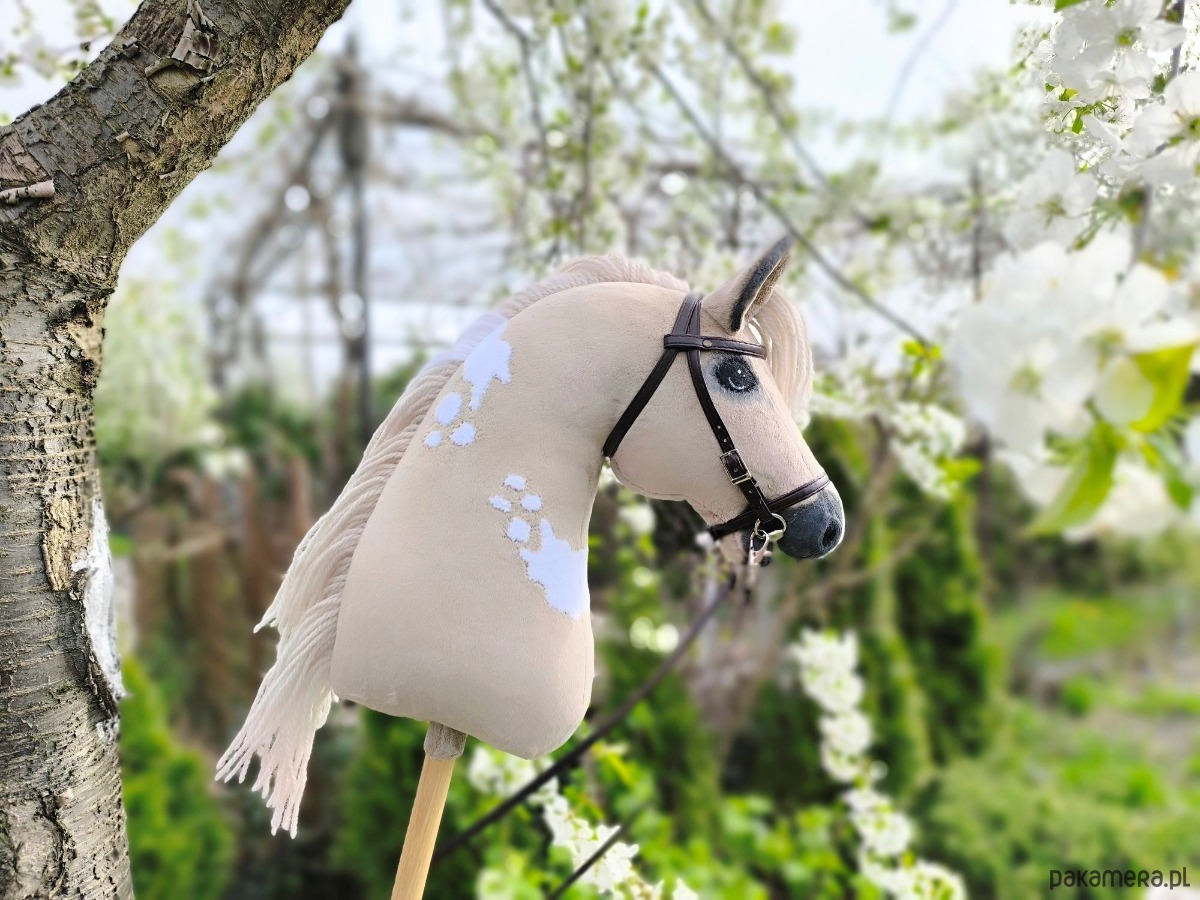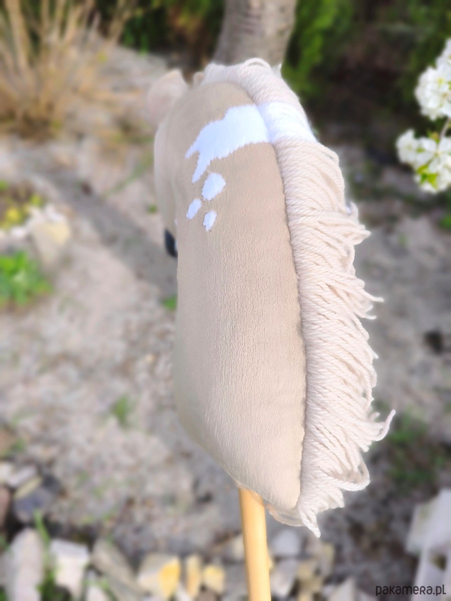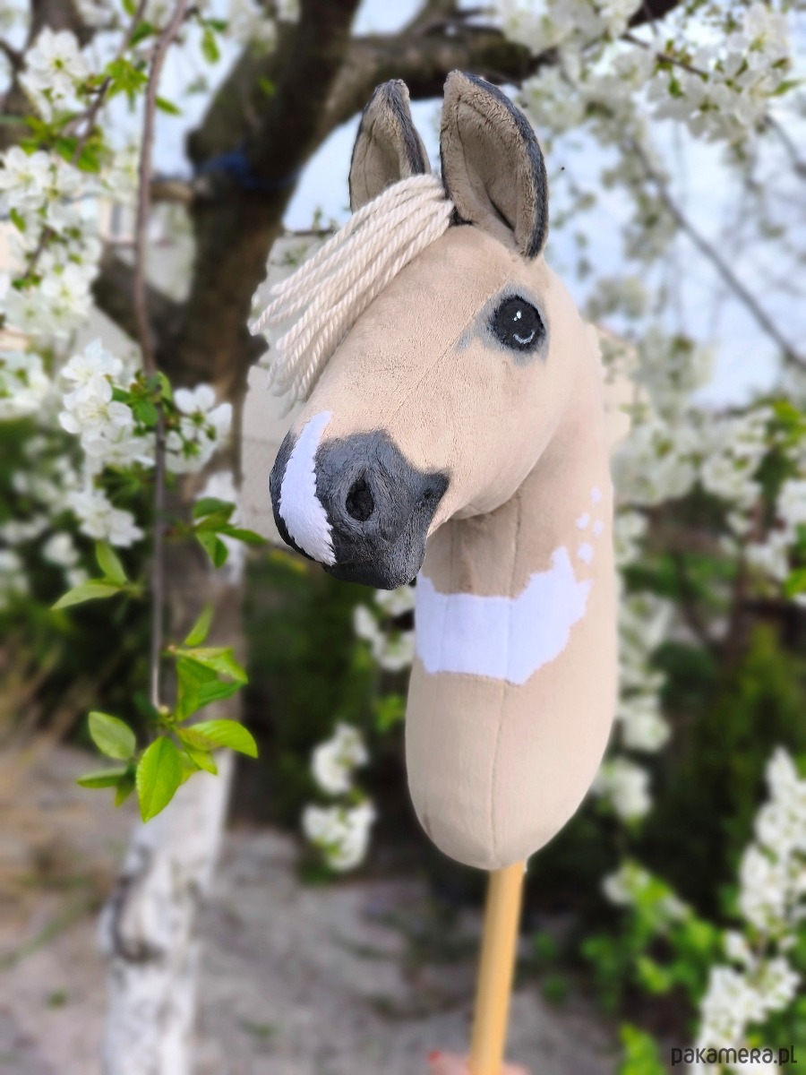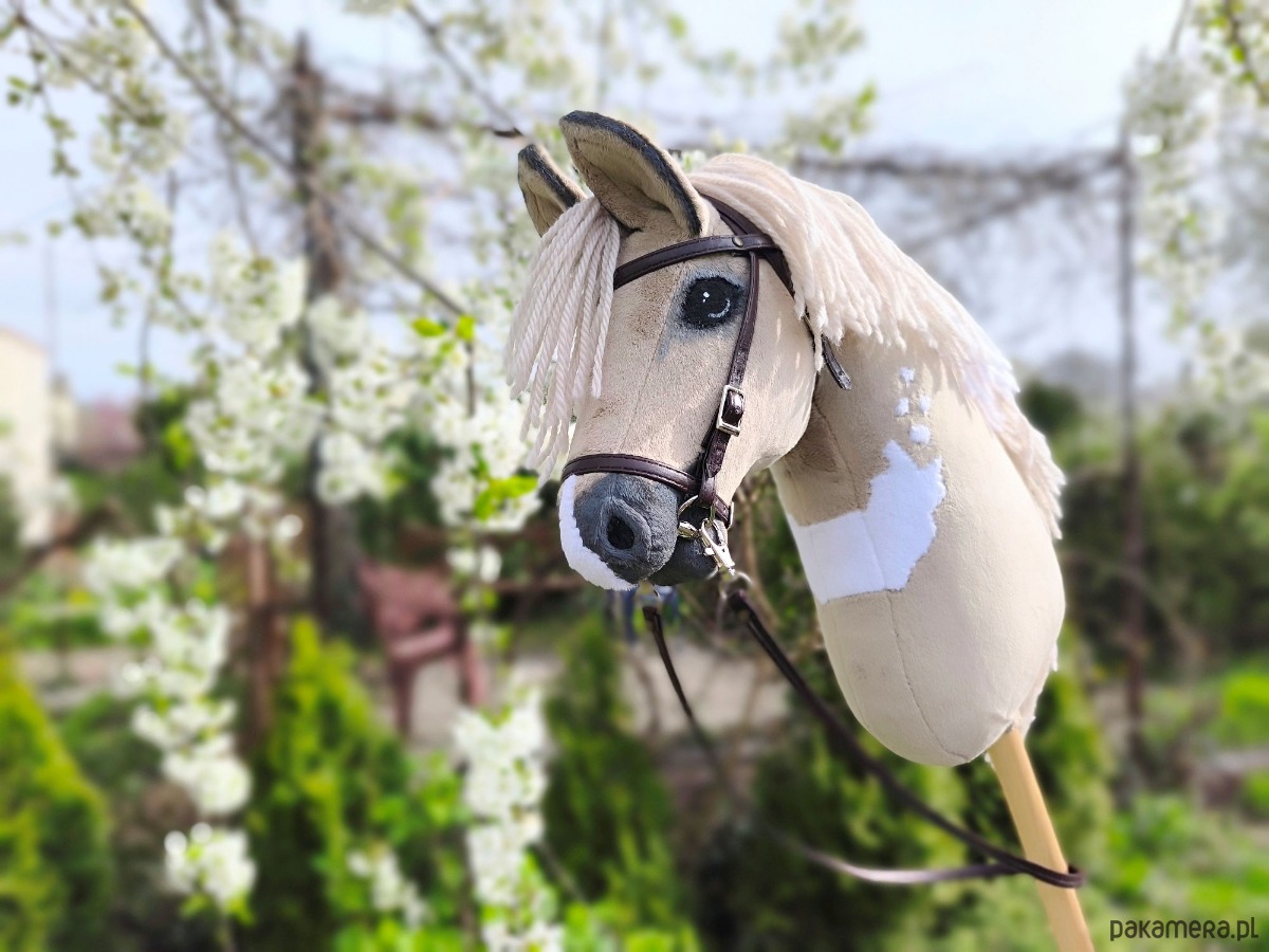 Szczegóły: rozmiar A3 (pyszczek ok. 28 cm, głowa z uszami ok. 41 cm, kij ok. 34 cm), waga około 950g, grzywa z włóczki, cieniowanie farbami akrylowymi, realistyczne chrapy, materiał minky, usztywniony flizeliną, wypełnienie kulką silikonową, bukowy kij. Produkt kolekcjonerski dla osób powyżej 14 lat uprawiających hobby horsing. Nieodpowiedni dla dzieci poniżej 3 roku życia. Zaleca się nadzór osoby dorosłej podczas użytkowania. Od razu gotowy do użycia. Kupując tego hobby horse'a wspierasz polskie rękodzieło. Ogłowie z wędzidłem i wodzami z eko skóry.