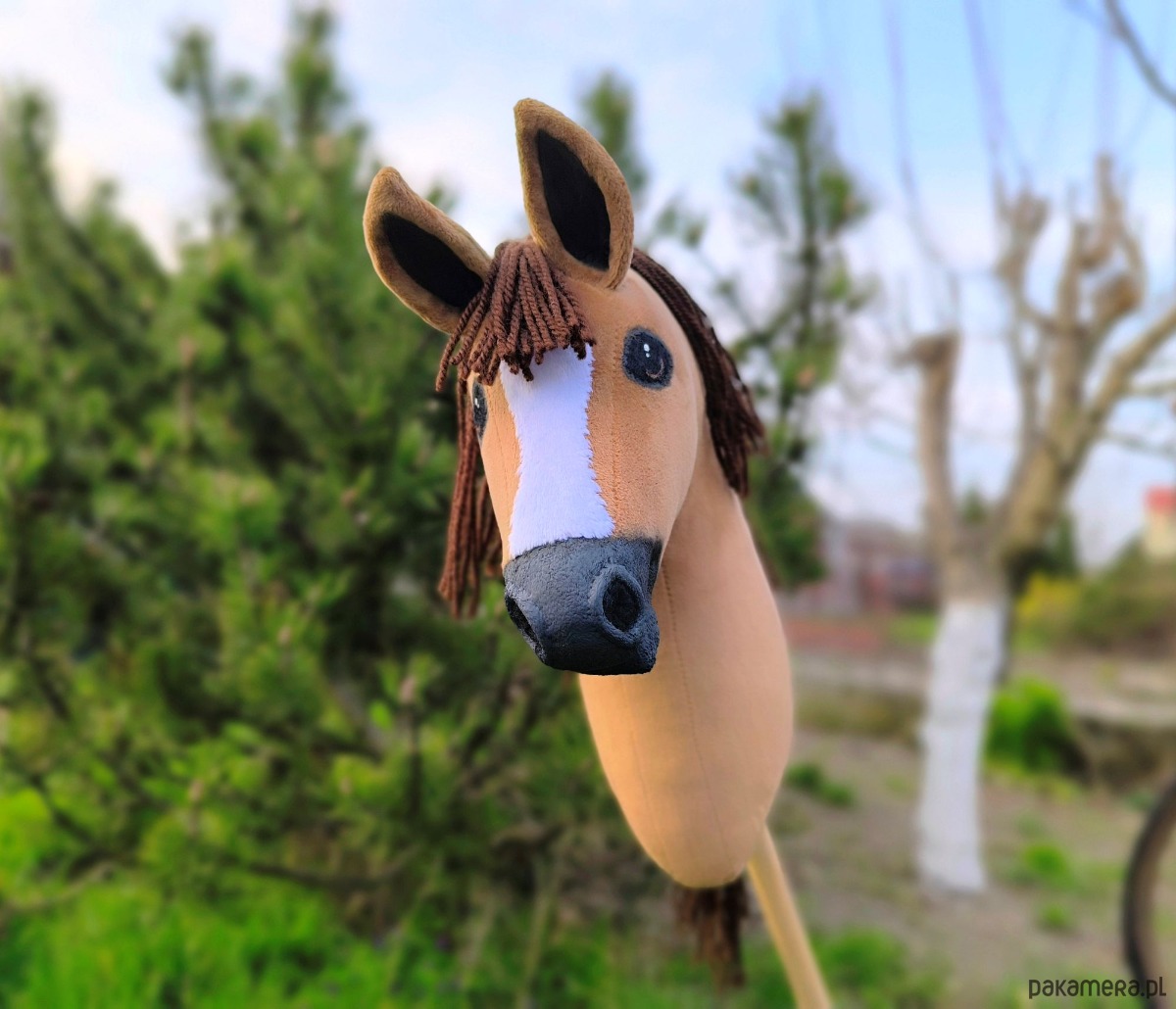 Szczegóły: rozmiar A3 (pyszczek ok. 28 cm, głowa z uszami ok. 40 cm, kij ok. 34 cm), waga około 850g, grzywa z włóczki, cieniowanie farbami akrylowymi, realistyczne chrapy, materiał minky, usztywniony flizeliną, wypełnienie kulką silikonową, bukowy kij. Produkt kolekcjonerski dla osób powyżej 14 lat uprawiających hobby horsing. Nieodpowiedni dla dzieci poniżej 3 roku życia. Zaleca się nadzór osoby dorosłej podczas użytkowania. Od razu gotowy do użycia. Kupując tego hobby horse'a wspierasz polskie rękodzieło. Ogłowie z wędzidłem i wodzami z eko skóry