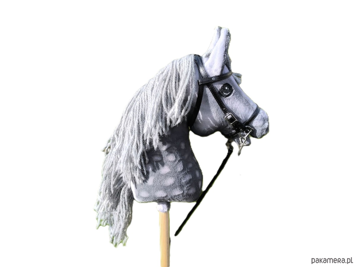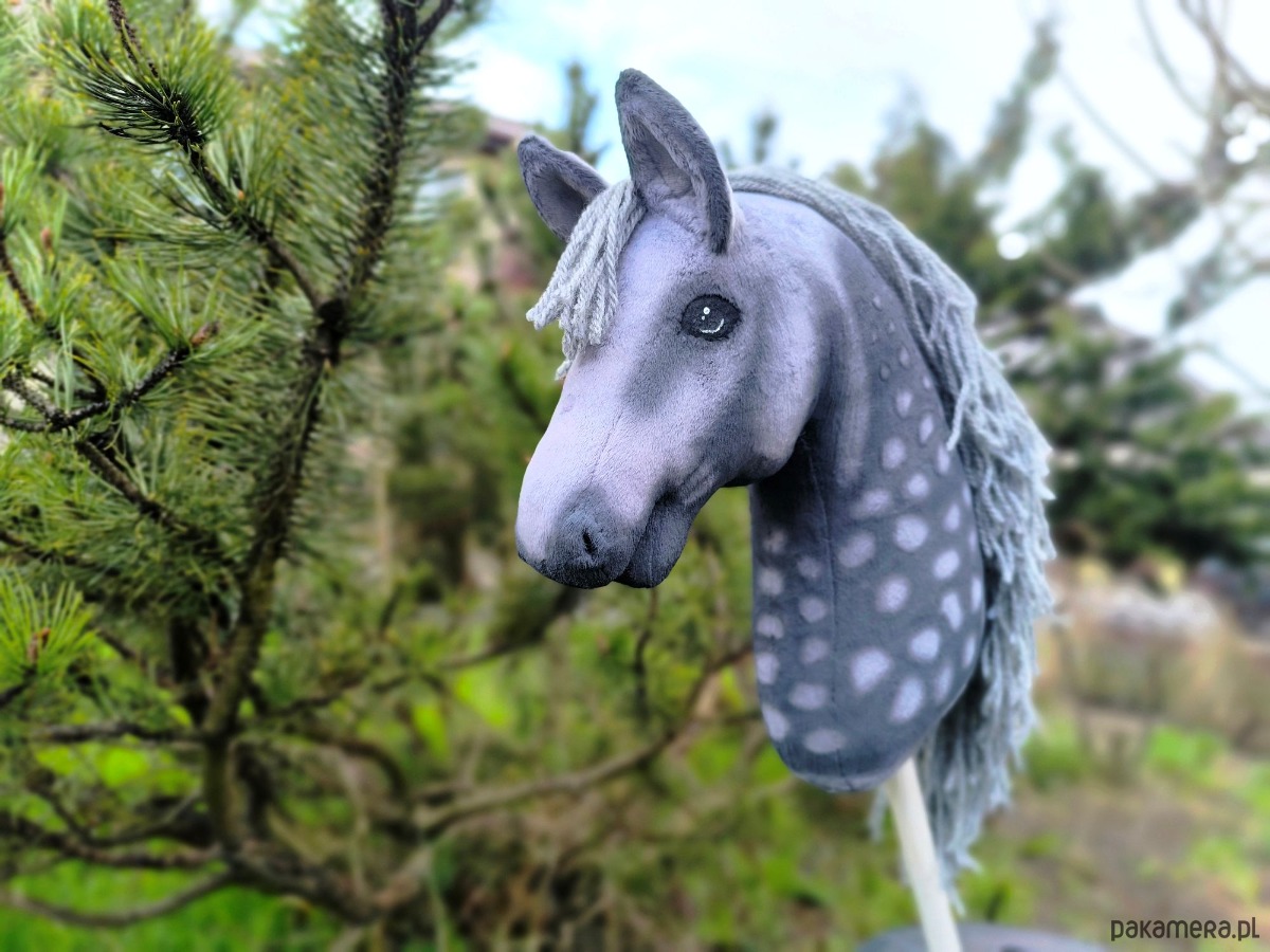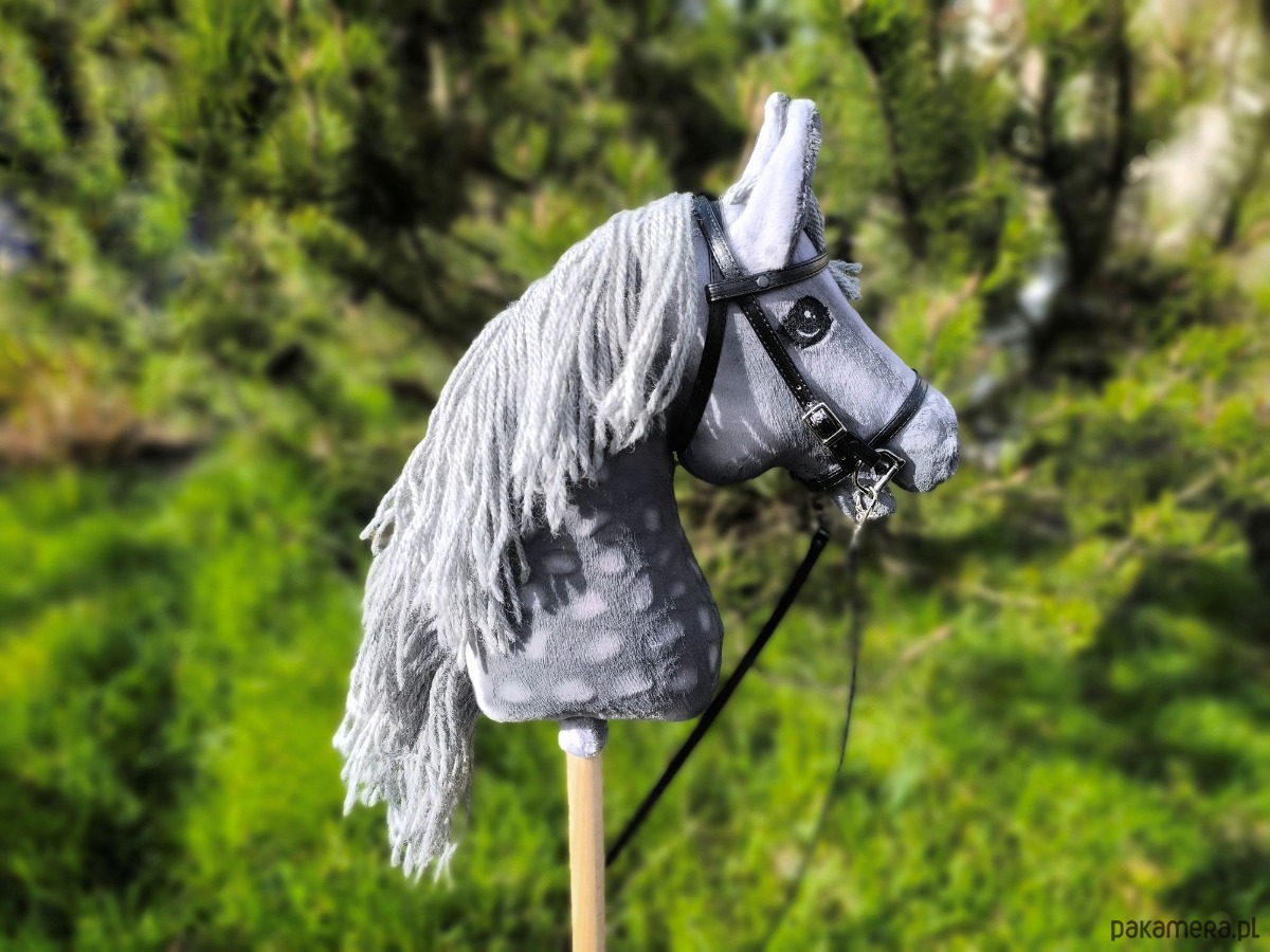 Szczegóły: rozmiar A4 (pyszczek ok. 25 cm, głowa z uszami ok. 32 cm, kij ok. 37cm), waga około 600g, grzywa z włóczki, cieniowanie farbami akrylowymi, realistyczne chrapy, materiał minky, usztywniony flizeliną, wypełnienie kulką silikonową, bukowy kij. Produkt kolekcjonerski dla osób powyżej 14 lat uprawiających hobby horsing. Nieodpowiedni dla dzieci poniżej 3 roku życia. Zaleca się nadzór osoby dorosłej podczas użytkowania. Od razu gotowy do użycia. Kupując tego hobby horse'a wspierasz polskie rękodzieło. Ogłowie z wędzidłem i wodzami z eko skóry.