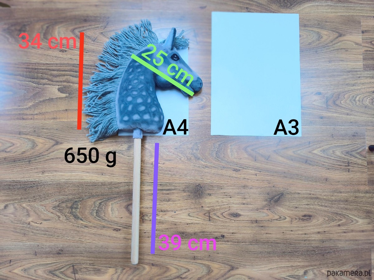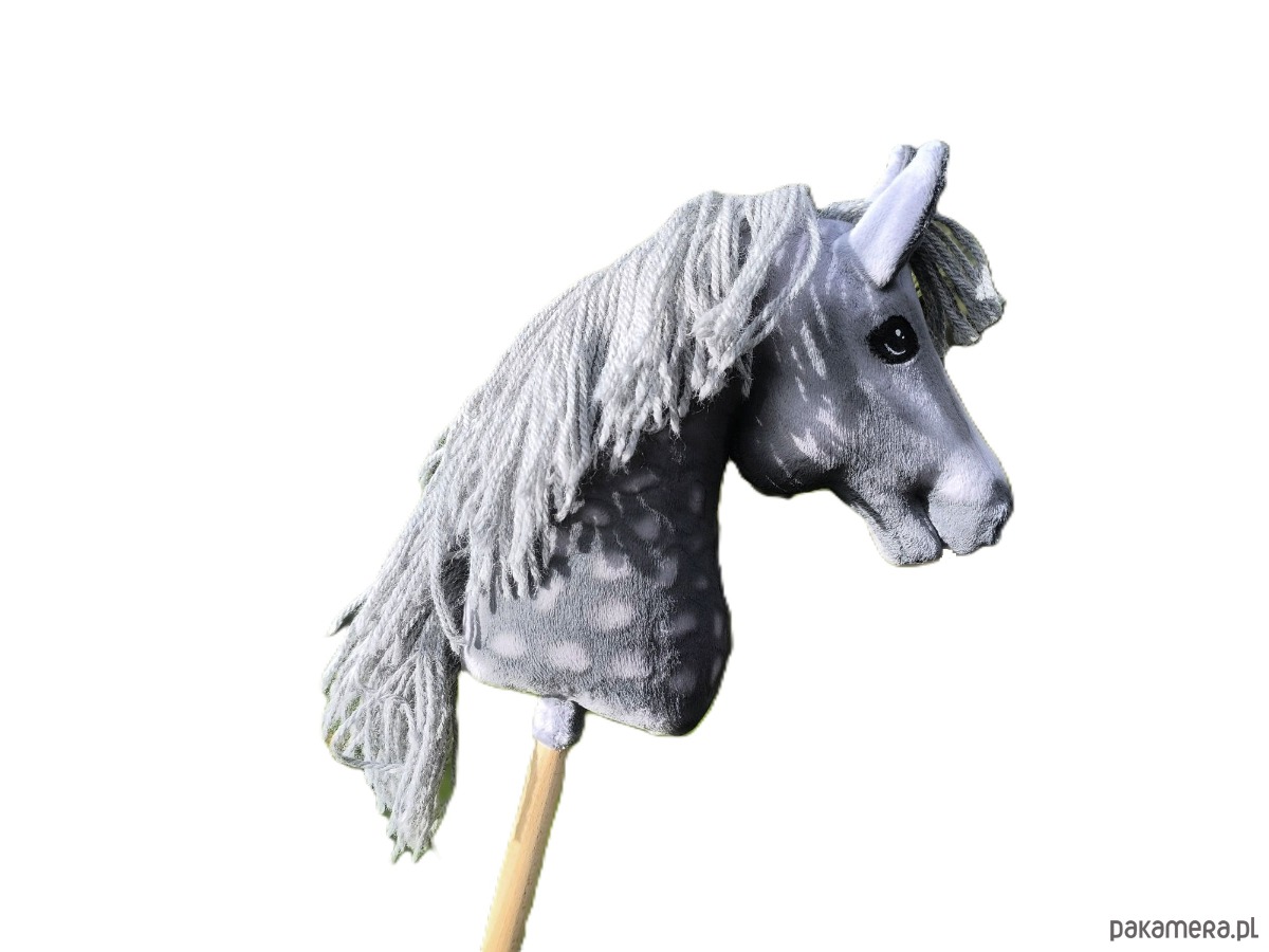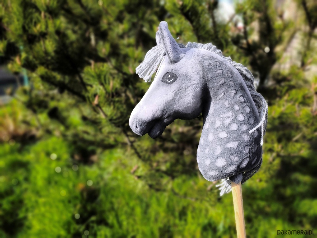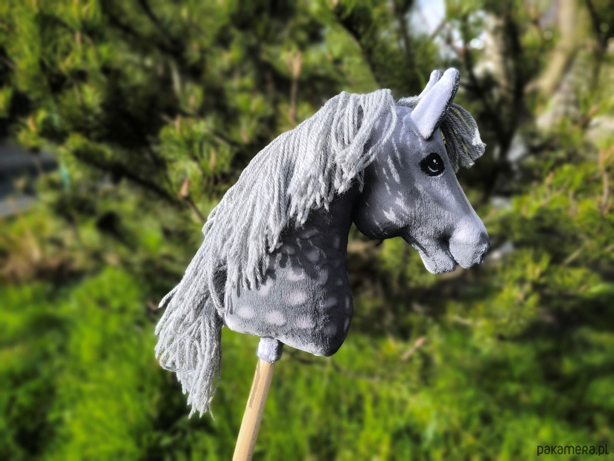 Szczegóły: rozmiar A4 (pyszczek ok. 25 cm, głowa z uszami ok. 32 cm, kij ok. 37cm), waga około 600g, grzywa z włóczki, cieniowanie farbami akrylowymi, realistyczne chrapy, materiał minky, usztywniony flizeliną, wypełnienie kulką silikonową, bukowy kij. Produkt kolekcjonerski dla osób powyżej 14 lat uprawiających hobby horsing. Nieodpowiedni dla dzieci poniżej 3 roku życia. Zaleca się nadzór osoby dorosłej podczas użytkowania. Od razu gotowy do użycia. Kupując tego hobby horse'a wspierasz polskie rękodzieło. Ogłowie z wędzidłem i wodzami z eko skóry.